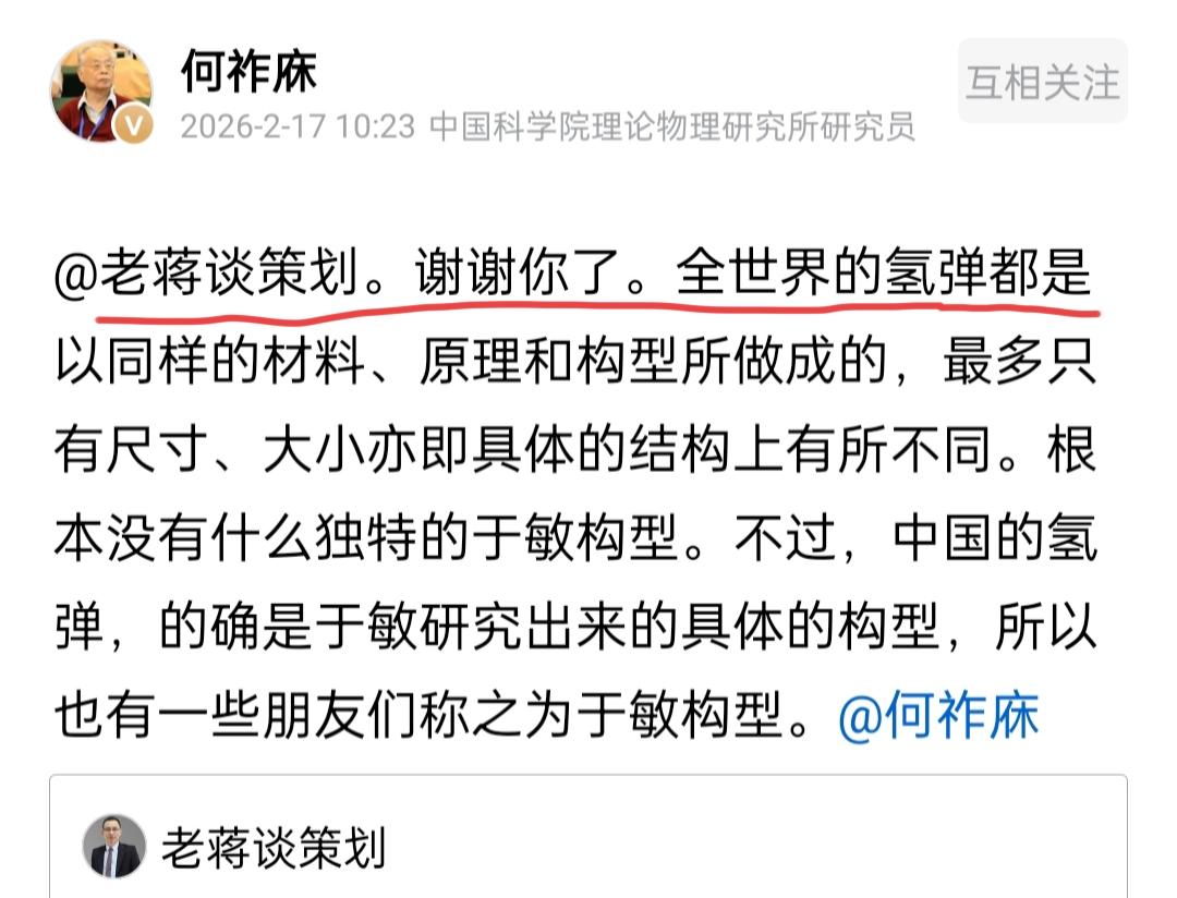何老院士曾给“谈策划先生”留言:当今世界,氢弹在选材、原理和构造上差别并不大。何