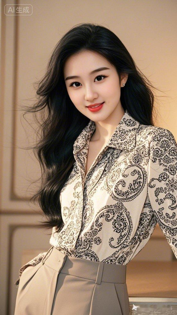 优雅黑发,复古印花衬衫,都市女性魅力