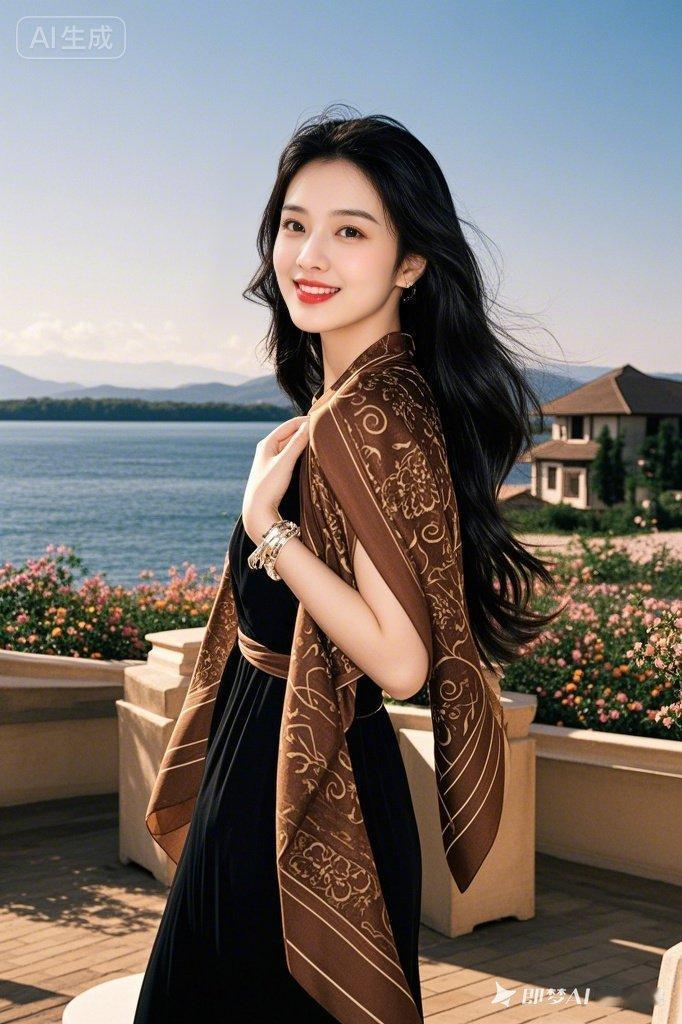 优雅黑裙搭配复古披肩,湖畔的浪漫时光