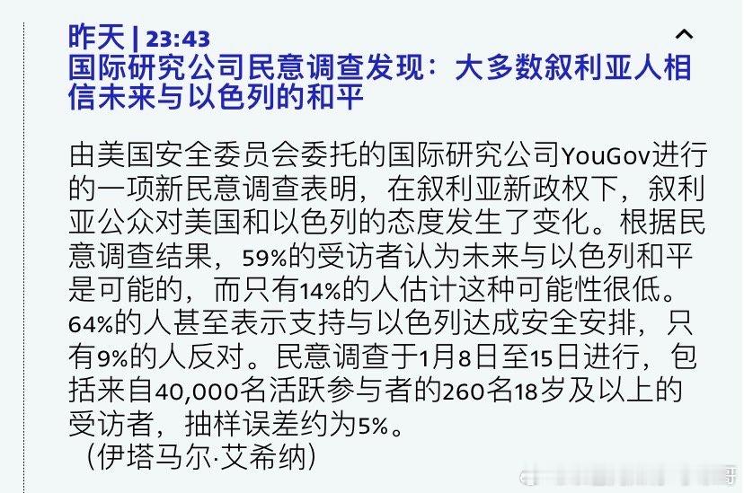 ‼️民意大部分叙利亚人要与以色列和平共处。这说明今后叙利亚也加入《亚伯拉罕协议》是大概率事件。海外新鲜事