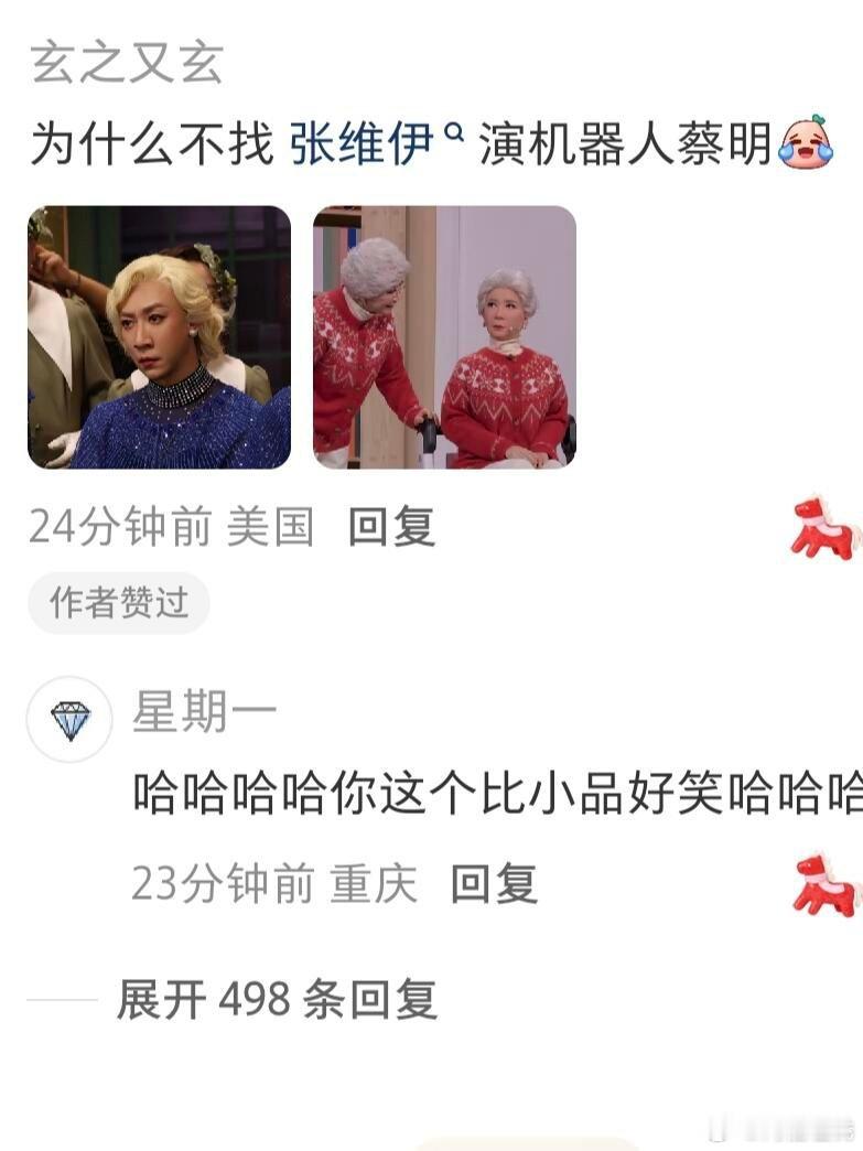 怎么不找张维伊演机器人蔡明发出了春晚第一声爆笑,有网友说怎么不找张维伊演机器人蔡明啊,你别说你还真别说,是有点相似度在身上的。如果真这么演爆梗有了春节刷到宝了