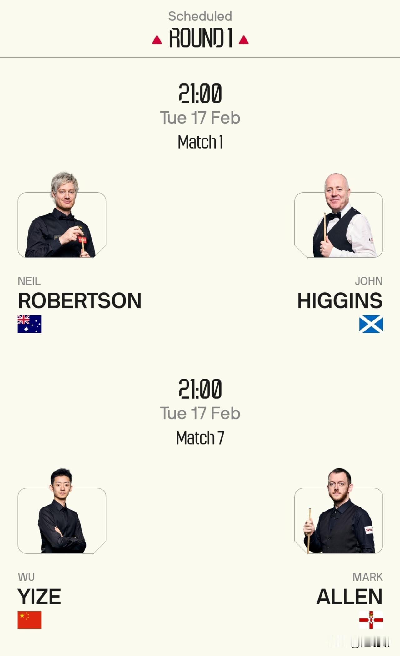 如果春晚和斯诺克同一时间播出,我会毫不犹豫选择看斯诺克。球员锦标赛就应该除夕夜开始,这样可以挽回我浪费的时间。 今天晚上两场重头戏,吴宜泽vs艾伦,萝卜vs巫师。吴宜泽与小钢炮交手3次,1胜2负。萝卜与巫师交手35次,萝卜19胜15负1平。 两边的交手记录胜负都很接近,关键就看临场发挥的状态了。预测将是比分非常胶着的两场比赛。