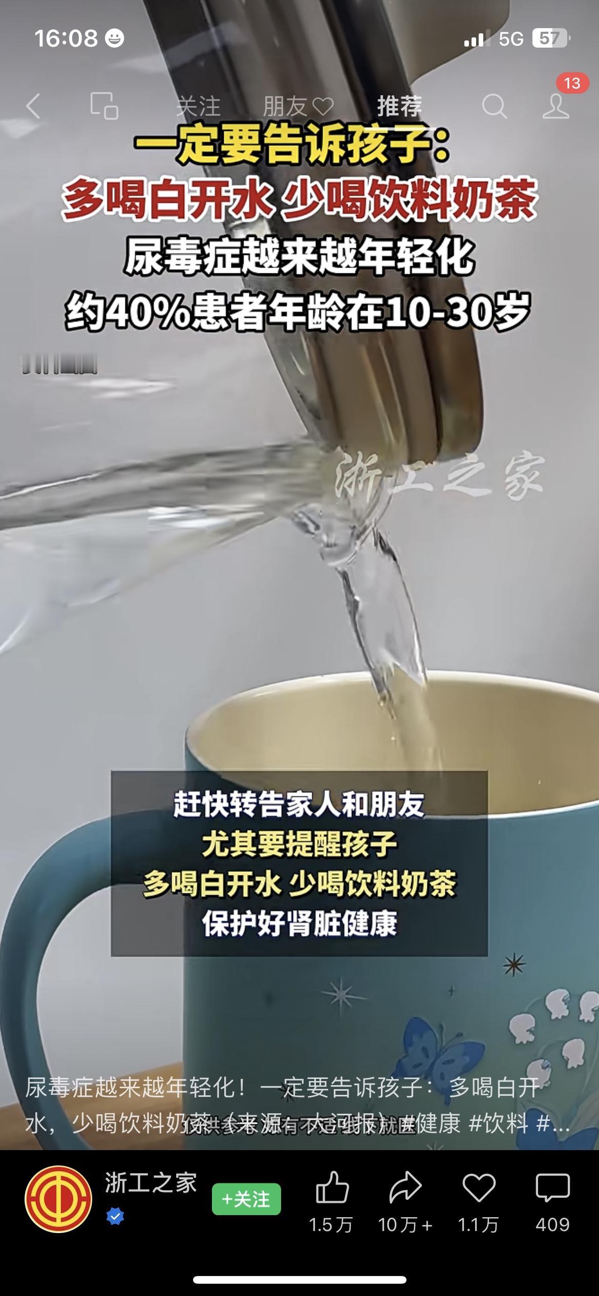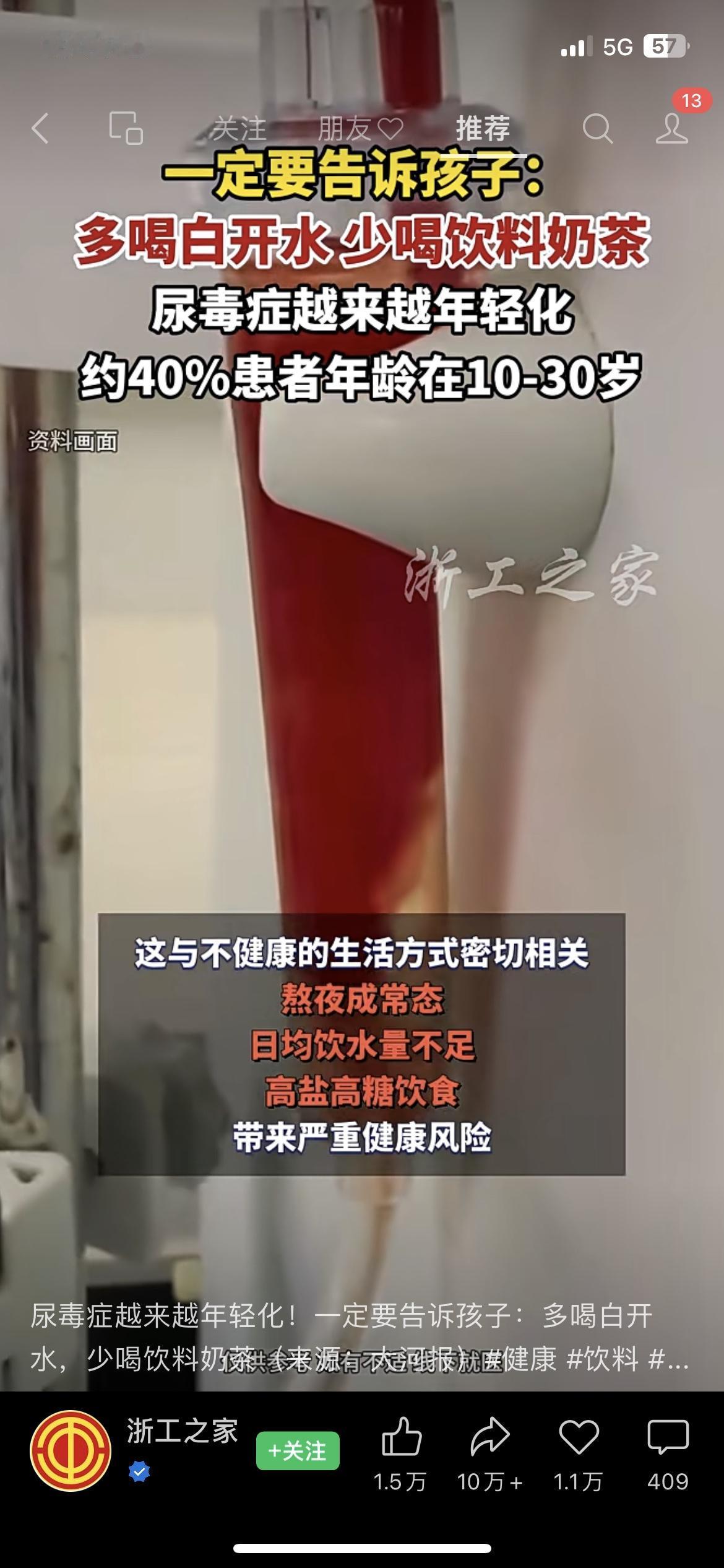 别再拿年轻赌健康了! 我国慢性肾脏病患病率已经达到10.8%,更扎心的是,接近40%的尿毒症患者年龄在10—30岁之间。 尿毒症不再是老年病,正在悄悄盯上年轻人。 长期熬夜、奶茶当水喝、高盐高糖外卖、喝水太少,都在一点点伤肾。 肾脏是沉默的器官,等疼了、难受了,往往已经晚了。 从今天起,少喝一杯奶茶,早睡一小时,多喝一杯白开水。 健康不是理所当然,是一点一滴养出来的。 尿毒症年轻化 健康养生 年轻人生活习惯