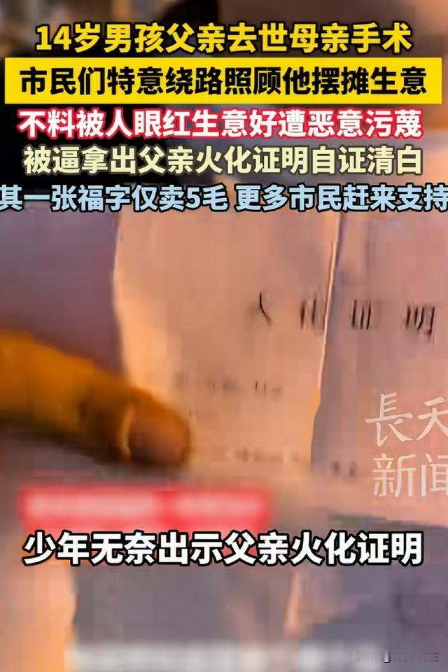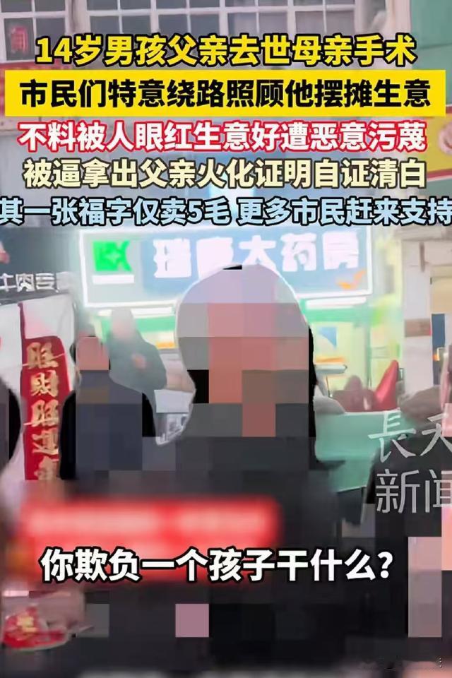 山东招远,父亲突然离世,母亲又生了病做手术,14岁男孩扛起家庭重担,在街头摆地摊卖春联,男孩一张福字只卖5毛钱,双手都冻裂了还在努力坚持,可有人看他生意好心生嫉妒,竟然污蔑男孩编故事博同情…… 据长天新闻报道,事情的起因,是一个大哥大晚上看到一个男孩在街上收拾春联摊子。 那个男孩看起来个子挺高的,就是一张脸还没长开,露着稚气。大哥有点好奇他怎么这么晚一个人收摊,就走过去问男孩多大了。 男孩最开始还有点谨慎,只向大哥嗯了一声没有多说,过了一会,大哥一直没走,男孩估计也看出来他不是坏人,就和大哥聊了起来。 这一聊,大哥心里顿时不是滋味起来。 原来,这个男孩看起来高高大大的,实际上只有14岁,他这么晚还在街上,是因为他家里没有大人可依靠了。 男孩的爸爸三四年前就走了,妈妈前一段时间又得了很严重的病,做了个大手术,男孩只能承担起家庭重担。 男孩每天都把自己的时间安排的满满的,平时早上上学前和晚上放学后,他会出去送外卖赚钱,放假后,他又干起了爸爸早些年的老本行,开始卖春联。 男孩做生意很实在,东西卖的也很便宜,福字甚至只要5毛钱一张。 在和男孩聊天的时候,大哥突然看到男孩的手都裂开了,他问男孩怎么搞的,男孩说在外面卖春联,一不小心冻的。 大哥看着非常心疼,说要买10张福字,男孩蹲在地上数福字,大哥偷偷拿出200块钱,男孩把10张福字递过来后,大哥将200块钱卷在两张福字里,说他只要8张。 随后,大哥付了钱离开了,结果男孩发现了大哥多给钱的事,又一路小跑过来把200块钱还了回去。 大哥回去后,对男孩又心疼又钦佩,就将这件事发了出去,结果视频意外爆火,很多人知道了男孩的事,跑老远过来照顾他生意。 男孩的摊子上一时之间挤满了人,同学也纷纷过来给他帮忙。 可让人没想到的事,男孩生意太好,竟然引得旁边一个大爷嫉妒,他挤到被人围住的摊子里,说男孩是骗人的,他的故事都是假的,男孩和妈妈的事也是他瞎编的。 没想到,男孩的同学立即走过去挡在前面,质问大爷为什么冤枉人,旁边的群众也纷纷指责大爷,为什么要为难一个孩子。 事情闹得很大,男孩为了自证清白,只好找出爸爸的火化证明自证清白,一边举着给大家看一边流泪。 让人不能理解的是,诬陷男孩的大爷并不是同行,他卖的是肉。 按理男孩卖的是春联,两个人的生意根本不搭杠,甚至男孩生意好,还能带动附近的人流,买大爷的肉的人也会更多。 大爷诬陷男孩编故事博同情,虽然不知道他到底是出于什么目的,但这种行为涉嫌侵犯男孩的名誉权。 《民法典》第一千零二十四条规定,民事主体享有名誉权。任何组织或者个人不得以侮辱、诽谤等方式侵害他人的名誉权。 大爷在没有事实依据的情况下,公然指责男孩骗人,大爷编造虚假事实诋毁男孩的行为,对男孩的名誉造成了损害。 不过,因为大爷这一闹,男孩因祸得福,他的春联摊更火了,很多人专程绕路过来买他的东西,也有很多人自发过去给他帮忙。 期间,很多人想要给他钱帮助他,但是男孩坚持不要,非要靠自己的劳动赚钱,一些爱心人士见他不收现金,又偷偷扫码给他赚钱。 爱心人士给男孩转账的行为在法律上属于赠与,依据《民法典》第六百五十七条,赠与合同是赠与人将自己的财产无偿给予受赠人,受赠人表示接受的合同。 爱心人士对男孩的遭遇非常同情和敬佩,自愿将钱财转账给男孩,符合无偿给予的特征。 大哥和爱心人士的善良之举,体现了人与人之间的温情。 而男孩在家庭变故面前,没有丝毫抱怨,用稚嫩的肩膀扛起生活的重担,靠自己的努力摆摊、送外卖,自强自立的精神令人动容。