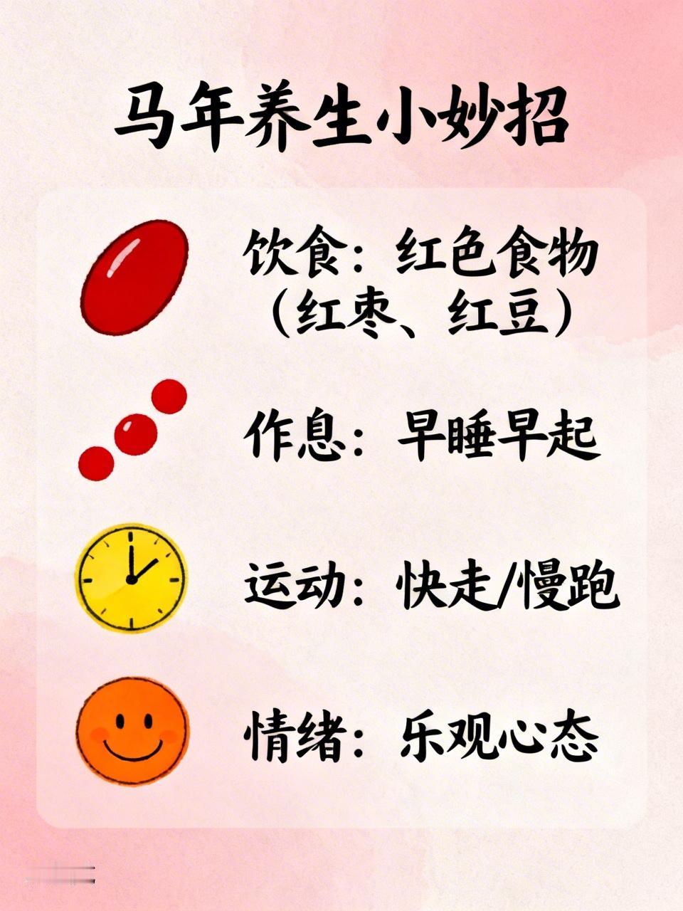 马年有哪些养生小妙招 马年养生,有些小妙招得码住。饮食上,多吃些红色食物,像红枣、红豆,它们富含铁元素,能补气血,让面色更红润。生活作息也很关键,尽量早睡早起,熬夜可是健康杀手,充足睡眠能让身体各器官好好休息。 运动方面,每天抽出半小时快走或者慢跑,促进新陈代谢,增强免疫力。情绪调节也不容忽视,保持乐观心态,少生气,气大伤身,心情好了,身体自然更棒。马年用这些小妙招养生,健康一整年!