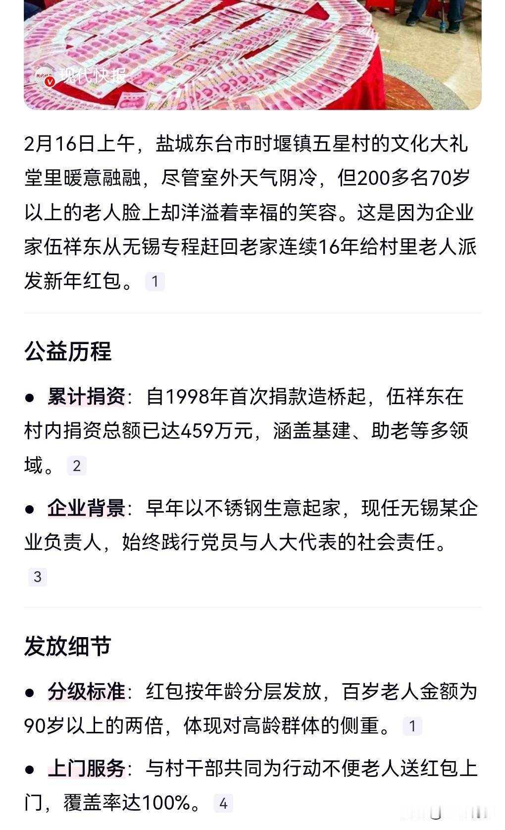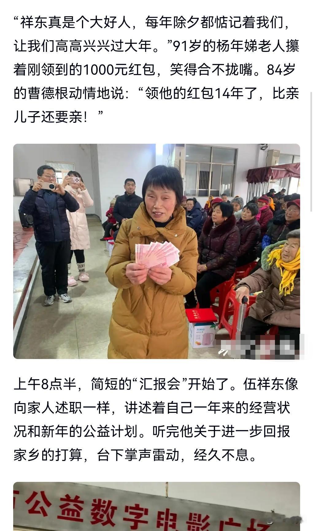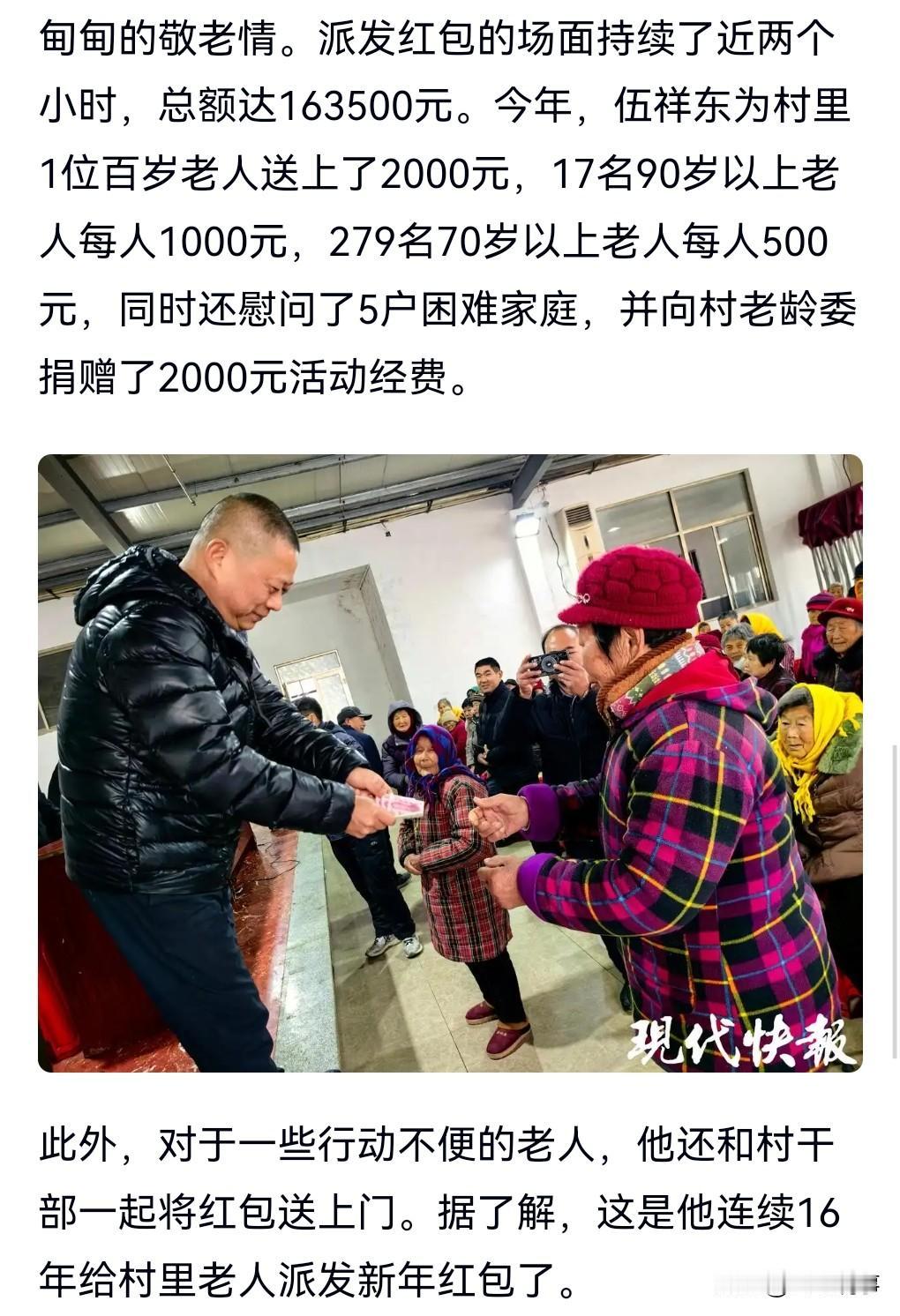 有一类人在社会中是非常无私的,会经常性的做好事,这很值得我们学习和肯毕竟赚的钱也不是大风刮来的。 有些人可能赚钱很容易,但是未必有这么大方。 2月16日,男子连续16年给超70岁老乡发红包,这么多年加上其他的一些钱,总共为家乡捐了有400多万了。 深受村里老人的喜欢,有的说他比亲儿子还亲。
