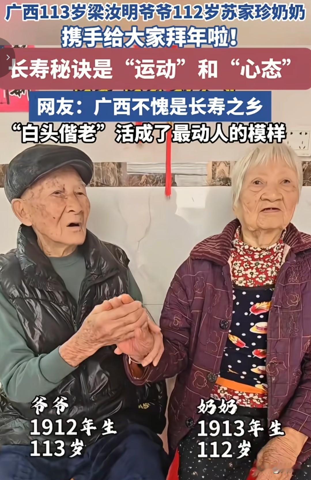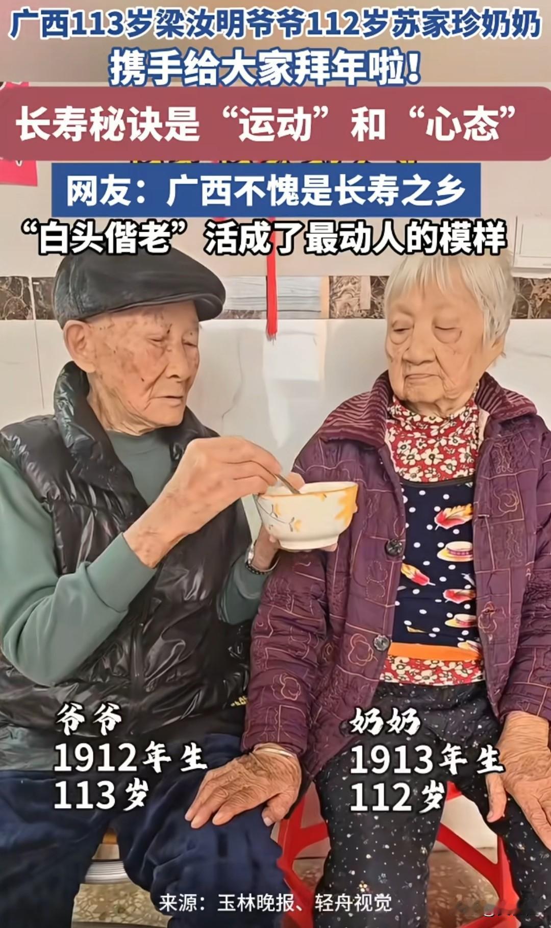 相扶到老,相濡以沫,神仙伴侣! 看到广西这对113岁爷爷和112岁奶奶的画面,真的太让人羡慕了。爷爷会细心喂奶奶吃饭,会紧紧牵着奶奶的手,眼神里全是温柔和在意。他们一起走过了快一个世纪,从青丝到白发,从年少到暮年,还能这样彼此依靠、彼此照顾。 现在的感情里,能走到最后的人太少了。很多人走着走着就散了,能像他们这样,把一辈子都过成“我们”的,真的太少太少。能遇到一个愿意陪你从年轻走到老,还能始终把你放在心上的人,大概是这辈子最幸运的事了。