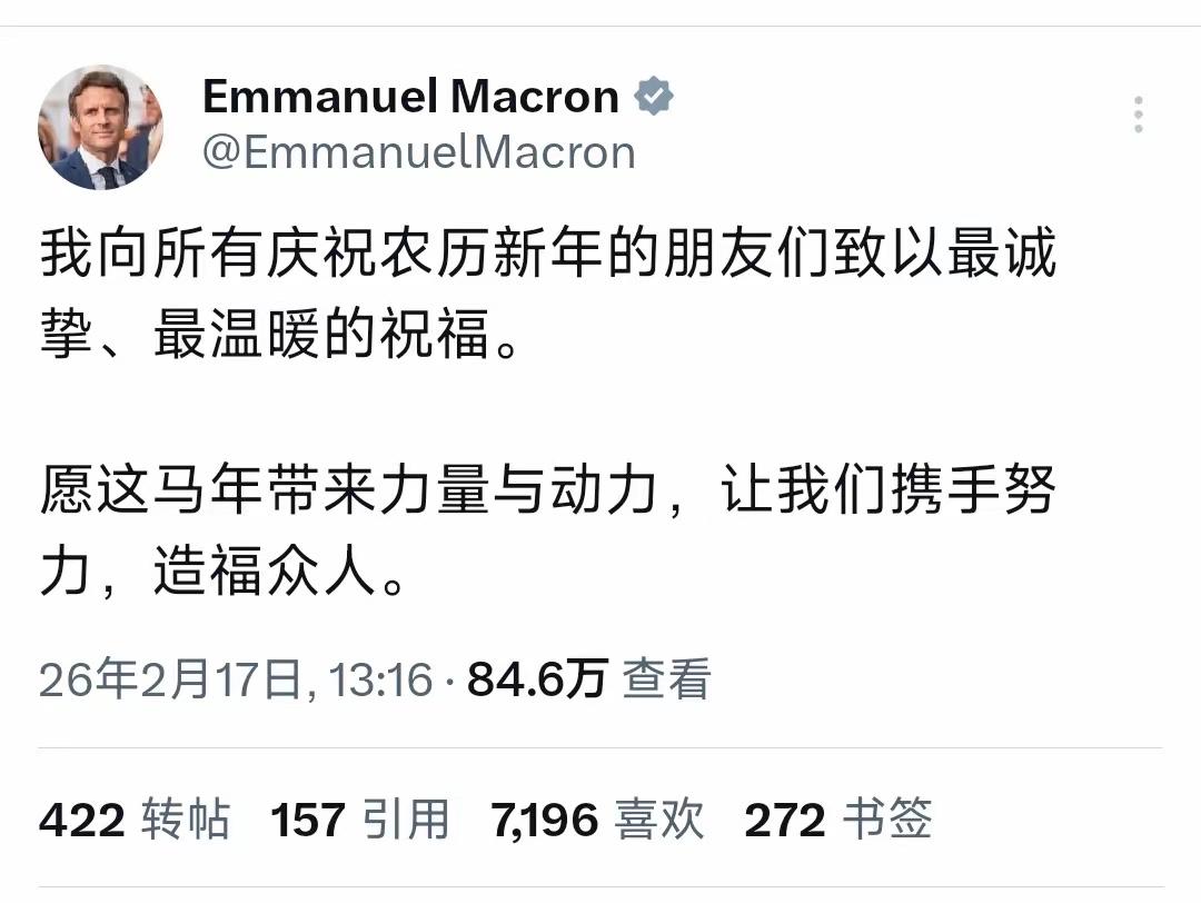 近日,法国总统马克龙写到:“我向所有庆祝农历新年的朋友们致以最诚挚、最温暖的祝福。愿这马年带来力量与动力,让我们携手努力,造福众人。” 变色龙马克龙实则这已不是他头一回显露“变色龙”特质。此前处理诸多国际事务,他态度如六月天,说变就变。 对华关系上,他曾高调访华,积极推动中法、中欧合作,承诺深化多领域交流,尽显友好。可回国不久,受别有用心势力影响,言论行动摇摆,发表涉华不当观点,搞外交“平衡木”,令人大跌眼镜。 欧洲事务也如此。马克龙时而强硬主张法国主导欧盟、推动战略自主;时而为迎合他国诉求妥协,法国政策连贯性与可信度受损。 此次借农历新年送祝福,不知何意。是真心互动,还是为政治利益“刷存在感”,难以捉摸。民众眼睛雪亮,这反复“变脸”能持续多久,时间会给出答案。