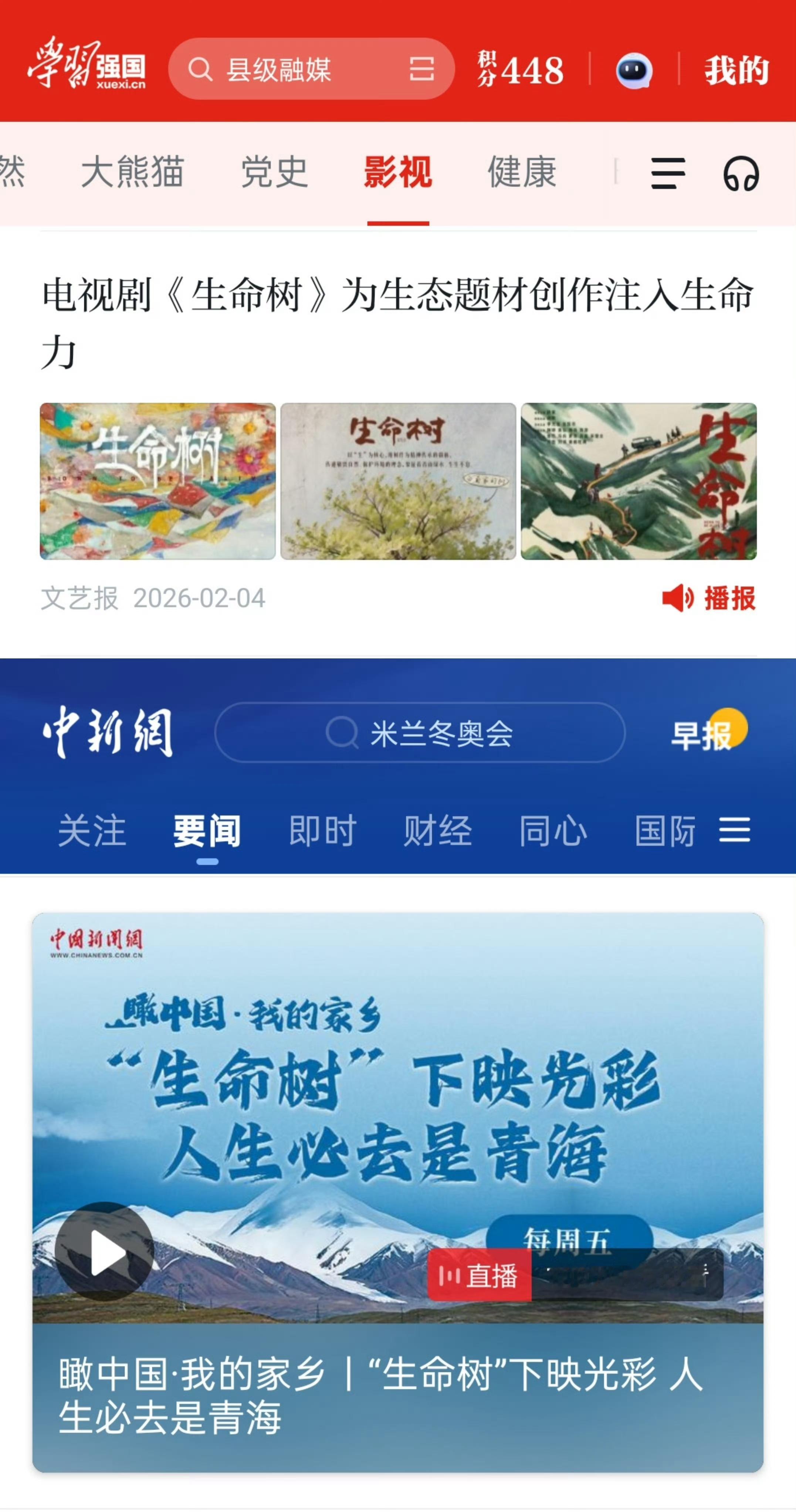 学习强国影视专栏首页有生命树相关报道:文艺报:电视剧《生命树》为生态题材创作注入生命力