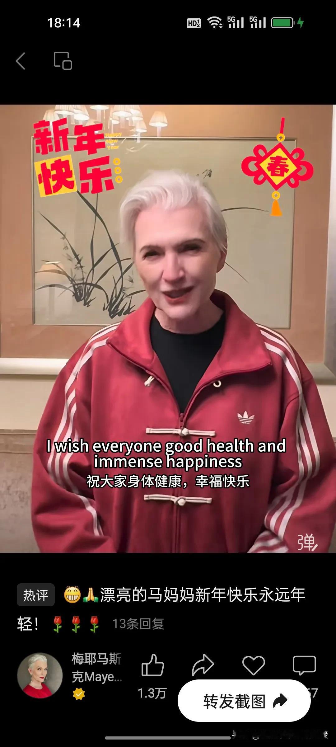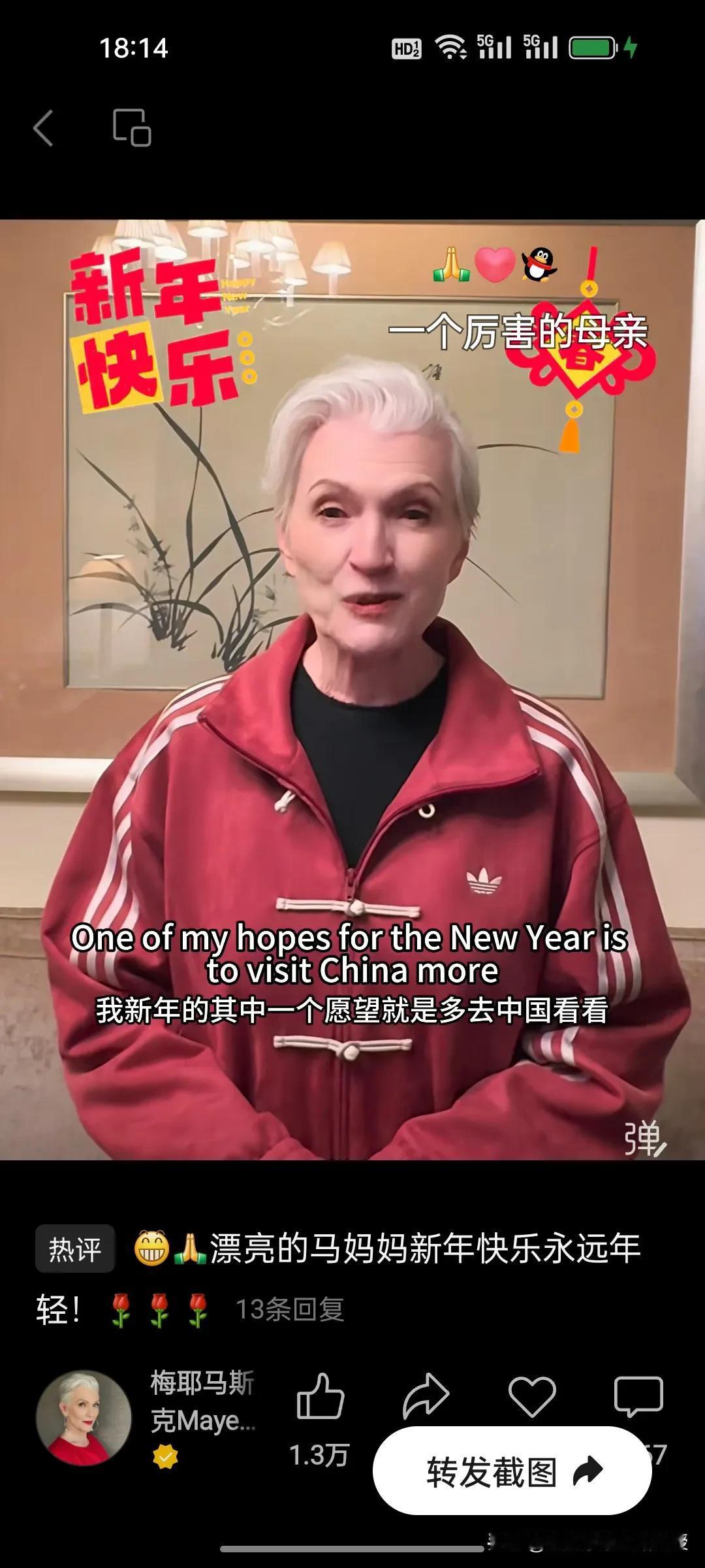 世界首富的妈妈新年愿望就是要来中国!刚刚,看到77岁的马斯克妈妈的新春拜年视频,第一句话就是“我亲爱的中国朋友们”,跟俄罗斯外交部发言人的开头一样,本来就是中国新年,对比鲁比奥和高市早苗的新春祝福“过农历新年的人们”,这两人实在是小心思太多。 马斯克妈妈很直接,说自己的新年愿望就是要来中国。这跟马斯克之前发文对美国网友说的“应该多去中国旅游”完全一致。 更有深意的是,马斯克妈妈穿的红色衣服背面还印着“马到成功”,这也是很应景了。世界首富马斯克的妈妈真的是毫不掩饰对中国的喜爱之情。