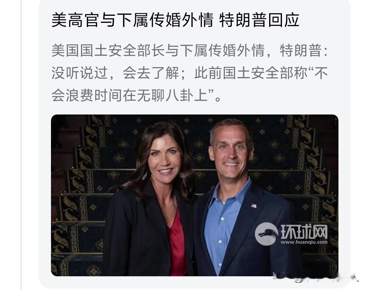 哇! 这婚外情有点“味道”呗! 请注意,这位女同志是美国防安全部长,不要搞混了啊![捂脸] 美国土安全部长与下属传出婚外情