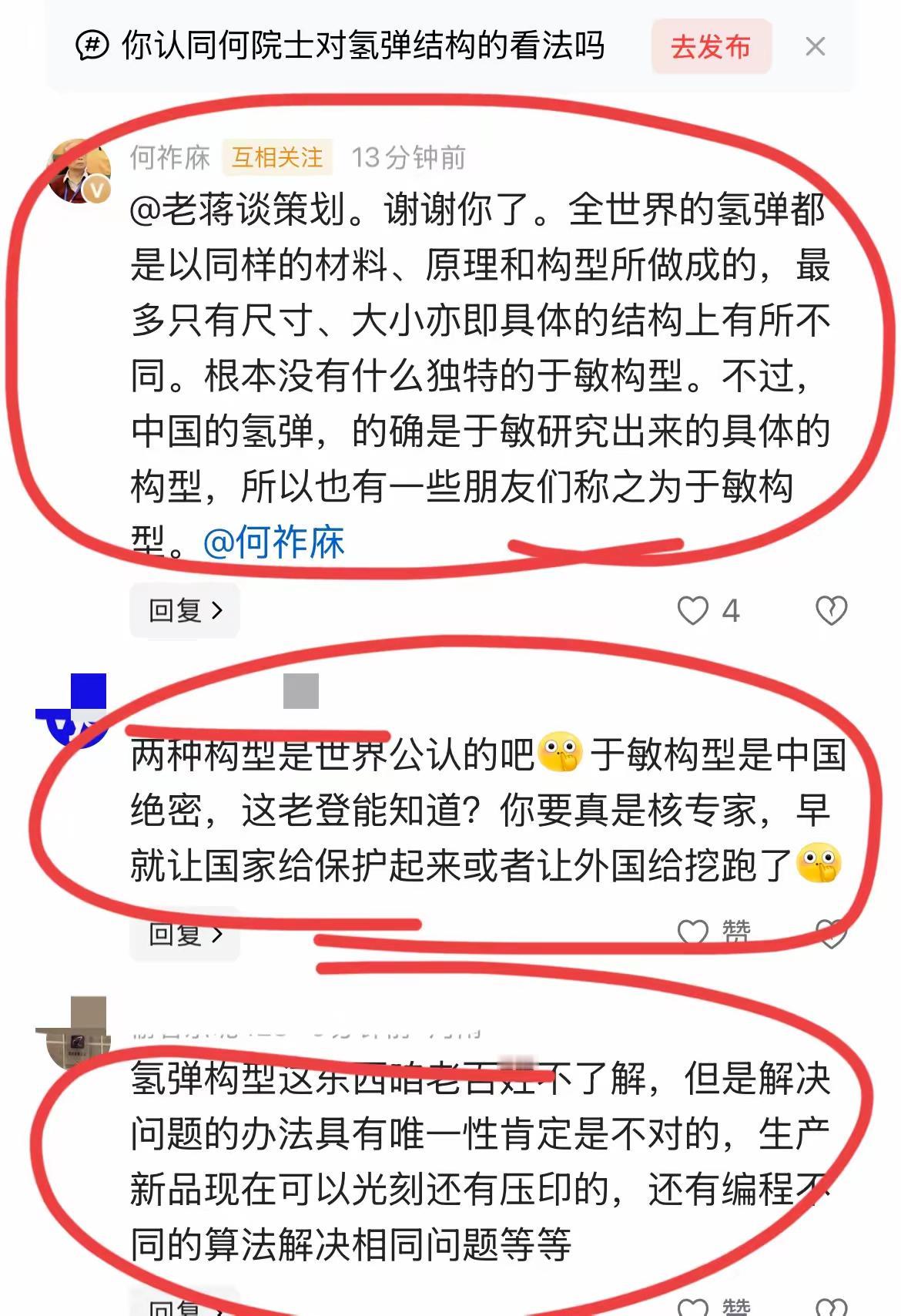 何祚庥否定于敏构型的氢弹存在。 请问,何祚庥是谁?他是物理学院士吗?他参与过氢弹设计吗?他凭什么质疑于敏构型氢弹的存在? 我很赞同图中的那个网友说的话。 氢弹这种绝密技术,原理肯定是相同的,但各个国家的结构应该,肯定是有差异的。 而国际上是认同氢弹有两种构型的,其中一种就是于敏构型。 所以我真的很想知道,这个何祚庥到底是什么人? 他有质疑于敏构型的科学知识吗? 他有质疑于敏构型的实力吗?