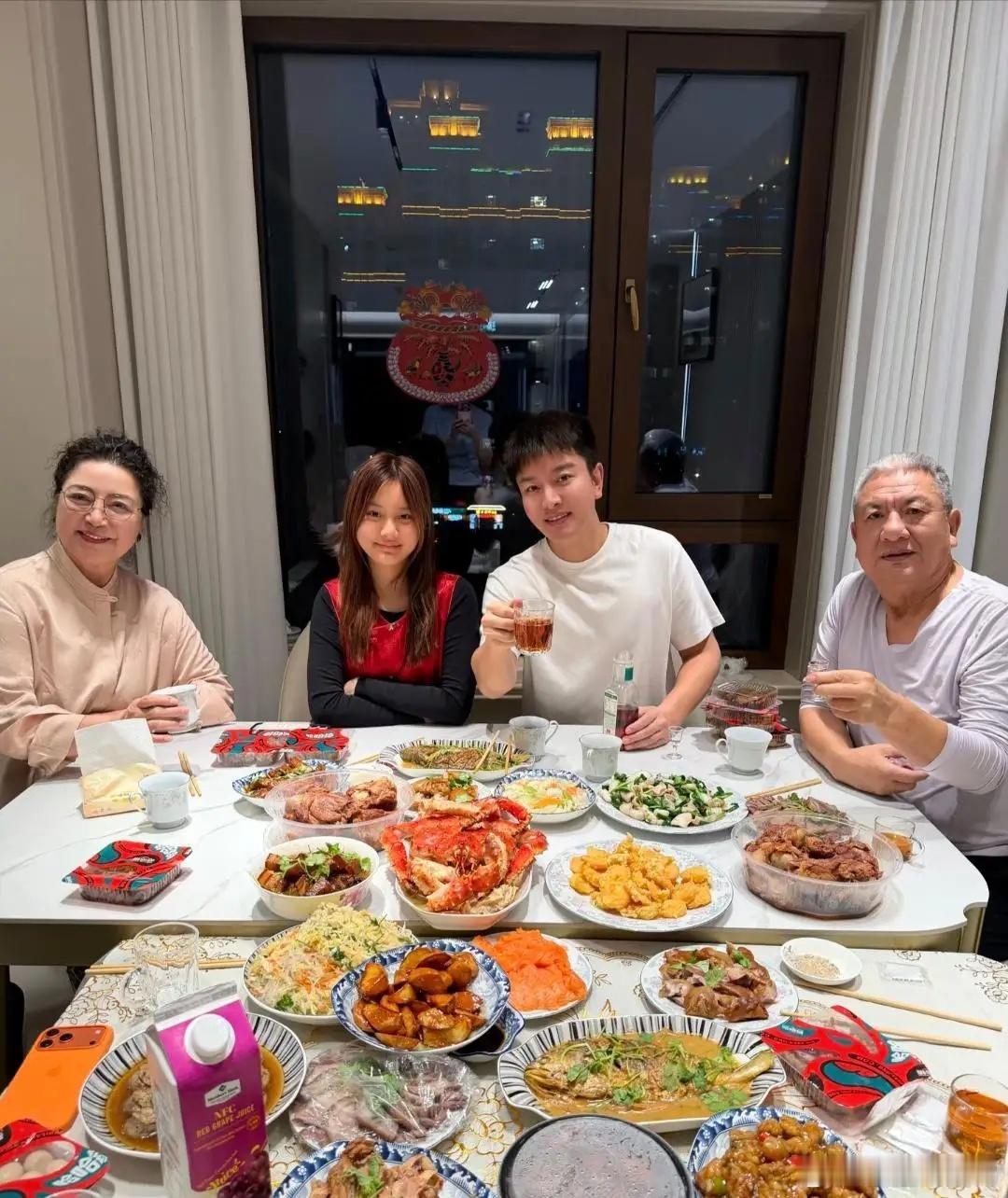 贾乃亮带着13岁女儿甜馨回东北陪父母过年了,他晒出年夜饭温馨合照,,甜馨和爷爷奶奶罕见同框,满满一大桌丰盛的美味佳肴,桌上摆满了大鱼大肉,看起来好奢侈啊!