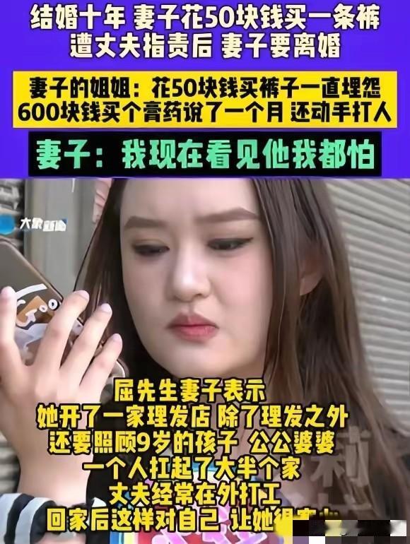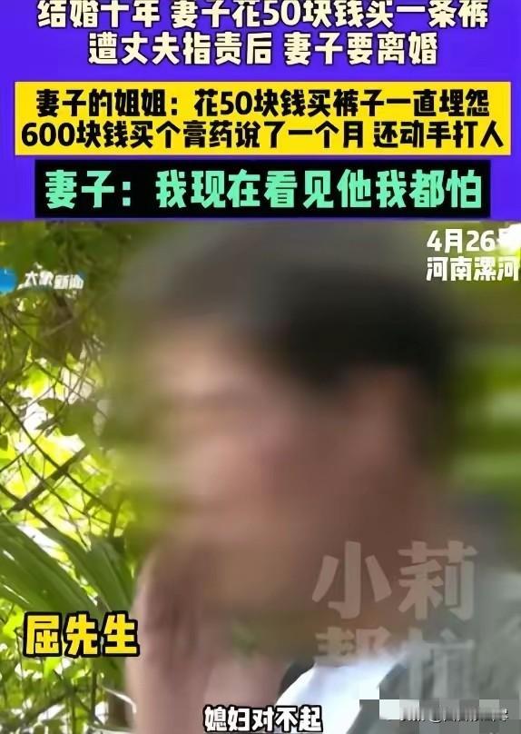 河南,女子花50元买了条裤子,不料,屈先生知道后,竟然直接对她破口大骂,说她乱花钱!女子一气之下提出离婚,本以为女子意气用事,可当得知屈先生平时的所作所为后,离婚就对了! 河南漯河,一场因50元裤子引发的婚姻变故,撕开了一段长达十年的婚姻里最真实的模样。 2025年4月,当地一名女子在换季时为自己添置衣物,在街边断码摊位挑选了一条价格实惠的裤子,仅花费50元,本是再普通不过的日常消费,却在丈夫屈先生知晓后,引发了激烈的争执。 屈先生得知妻子的消费行为后,没有询问价格与用途,直接漯河,一场因50元裤子引发的婚姻变故,撕开了一段长达十年的婚姻里最真实的模样。 2025年4月,当地一名女子在换季时为自己添置衣物,在街边断码摊位挑选了一条价格实惠的裤子,仅花费50元,本是再普通不过的日常消费,却在丈夫屈先生知晓后,引发了激烈的争执。 屈先生得知妻子的消费行为后,没有询问价格与用途,直接对妻子进行言语指责,将这桩小事定性为乱花钱,全然不顾妻子多年来对家庭的付出与节俭习惯。 女子与屈先生结婚十年,婚后一直承担着照顾家庭的全部责任,家中老人的起居、孩子的日常照料、家务琐事都由她一人打理,闲暇时还会做零工补贴家用。 生活中她始终精打细算,衣物多是平价款式,多年来很少为自己添置新东西,这次购买50元的裤子,也是出于实用需求。 屈先生常年在外务工,对家庭内部的辛劳缺乏体会,在消费上对妻子有着近乎苛刻的管控,日常小额支出都会被反复盘问,女子稍有自主消费,便会迎来指责与不满。 长期的压抑与不被尊重,在这次50元裤子的争执中彻底爆发,女子没有像以往一样妥协忍让,而是当场提出离婚。 这个决定看似突然,实则是十年婚姻里无数次委屈积累的结果。在这段婚姻中,女子始终处于被管控、被忽视的状态,个人需求被无限压缩,连最基本的小额消费都要承受指责,没有得到应有的尊重与体谅。 屈先生的行为,不仅是消费观念的差异,更是对妻子付出的漠视,把家庭的付出当成理所当然,把妻子的节俭当成随意苛责的理由。 从提出离婚开始,女子没有动摇自己的决定,十年的婚姻生活里,她独自扛起家庭重担,却连满足自身基本需求的权利都没有,50元的裤子成为压垮这段婚姻的最后一根稻草。 整件事没有激烈的冲突转折,却真实展现出一段失衡婚姻里的日常,长期的情感忽视与过度管控,最终让一段亲情走到了无法挽回的地步。 对此,你们有什么看法,欢迎评论留言~