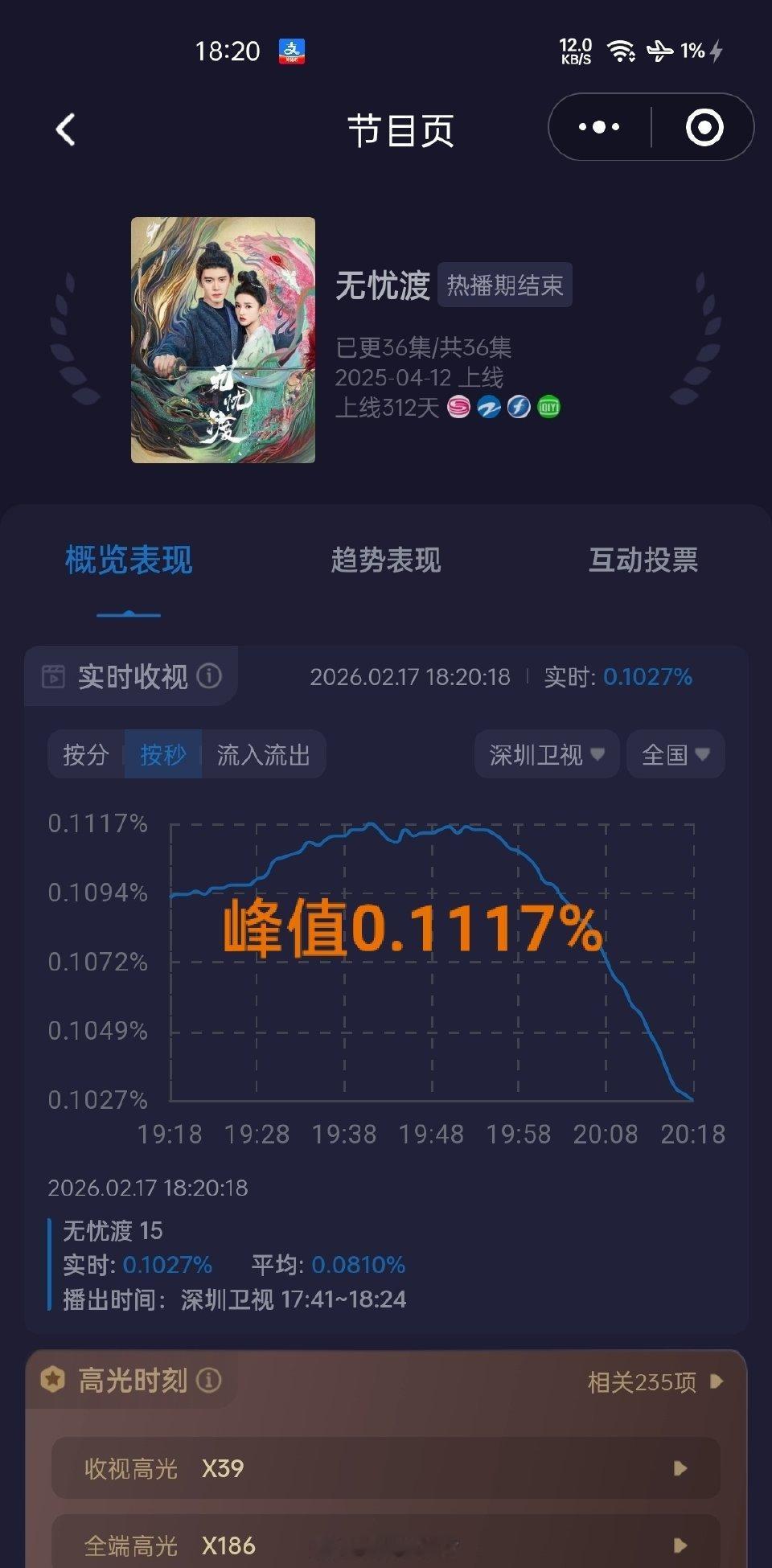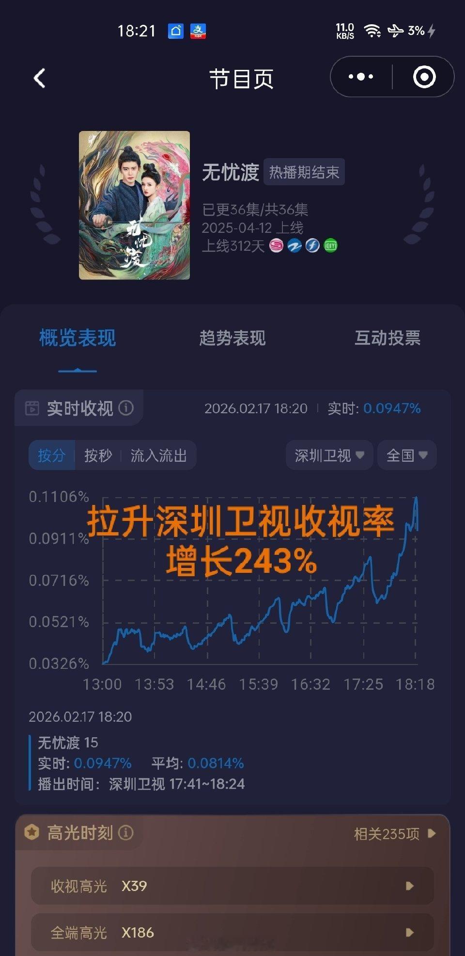 任嘉伦《无忧渡》深圳卫视重播第三天,酷云收视率从接档0.0326%拉升至峰值0.1117%,暴涨243%,为接档前3.4倍。明天起继续7集连播看久宣夜