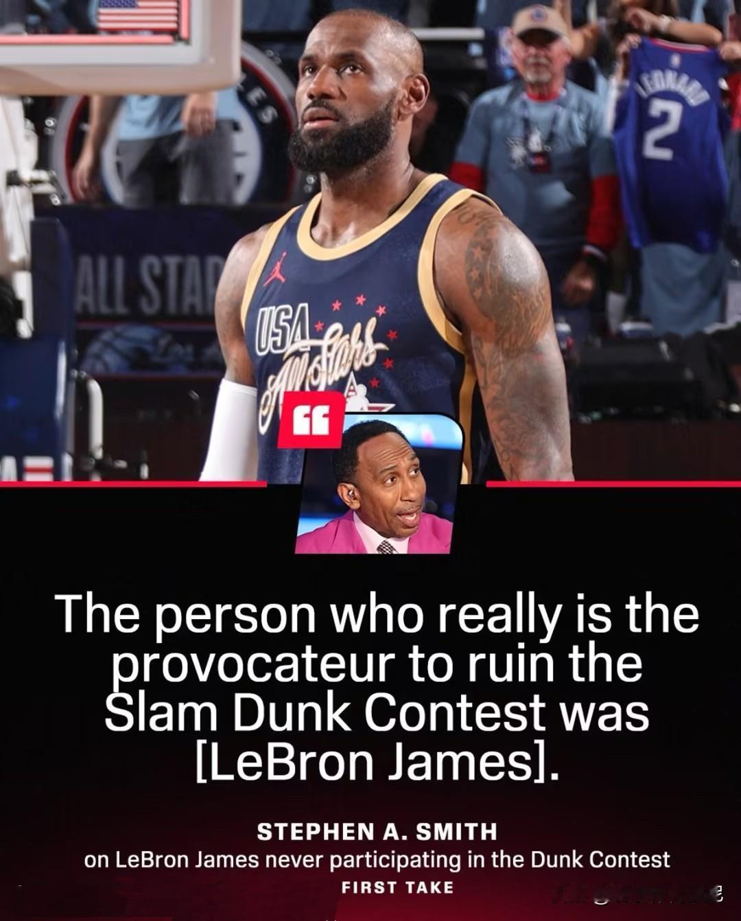 美名嘴A-史密斯痛斥詹姆斯“毀了”全明星扣篮大赛,正是因为詹姆斯带头拒绝参加扣篮大赛起了负面影响,后起之秀稍有名气的球星有样学样也不参加,从而让扣篮大赛越来越星光黯淡。 A-史密斯:“詹姆斯出场的每一晚都在表演扣篮,但他却一再拒绝参加扣篮大赛,哪怕是一次都没有。作为联盟力捧的球星,正是他只为自己,不负责任,不为联盟持续发展考虑的作为毀了扣篮大赛。” A-史密斯的言论虽有些偏激,但扣篮大赛越办越差,作为后科比时代的联盟门面球员勒布朗带头不参加有着不可推卸的责任。