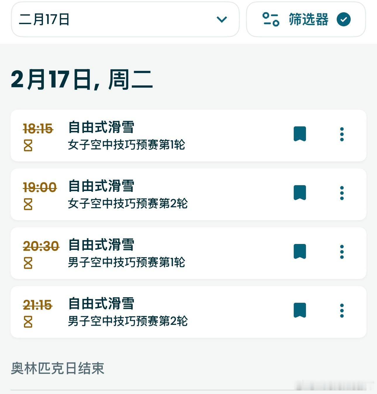 由于天气原因原定于北京时间2.17 18:15-21:15进行的男/女子技巧预赛第一轮/第二轮比赛改期进行时间待定全民聊冬奥
