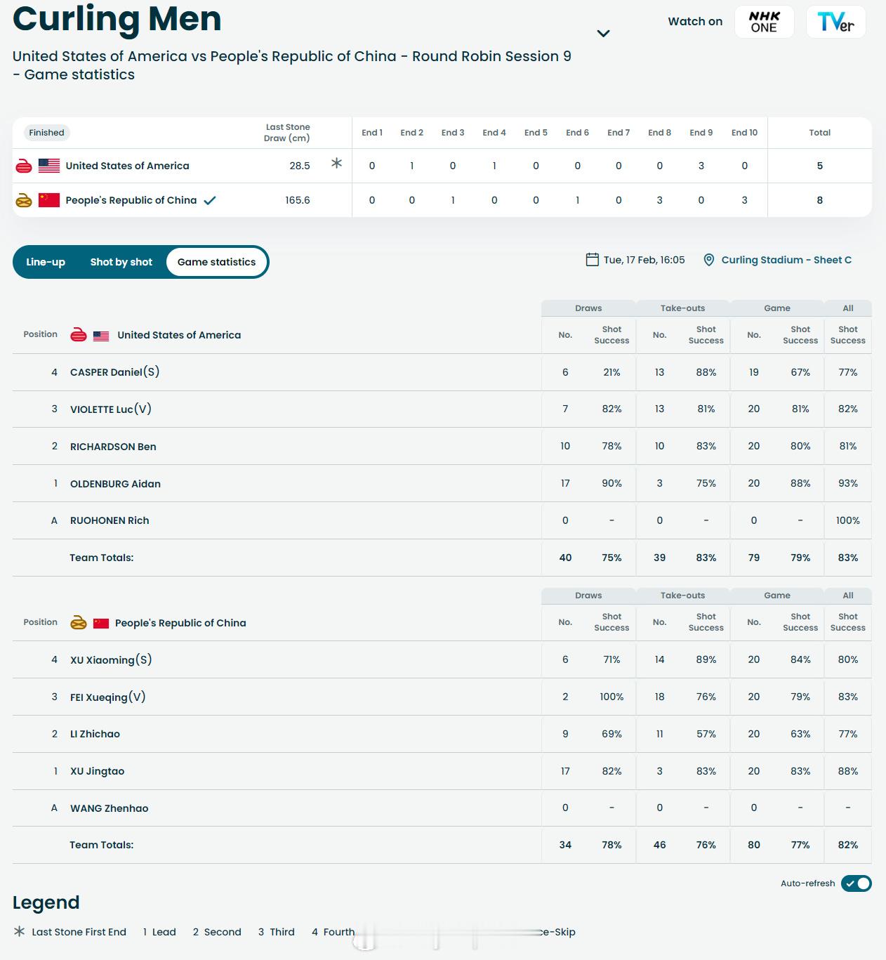 【冬奥男子冰壶中国8-5力克美国 取得两连胜】冬奥会中国冰壶男队vs美国 2月17日,冬奥男子冰壶循环赛中国8-5力克此前4胜2负的美国,在五连败后取得两连胜。本场比赛前七局波澜不惊打成2-2,但是从第八局开始风云大变。美国队先是在第八局失误让中国队偷到3分,随后又在第九局赚回3分,最后一局徐晓明最后一投抓住双飞机会,以8-5锁定胜利。中国冰壶男队8比5美国队中国冰壶男队两连胜