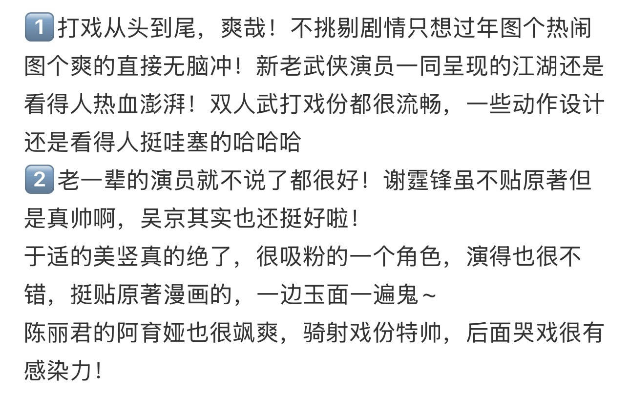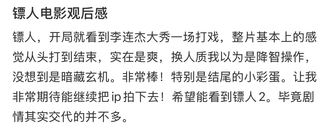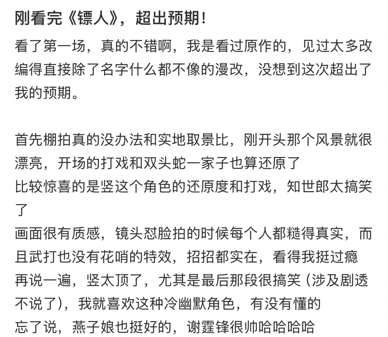 镖人口碑给到人上人 都给我去看《镖人》!打戏绝了,开场就是李连杰、张晋、吴京对打,行云流水看得超爽!大沙暴那段也是能动手绝不废话,动作戏真的是电影级享受!