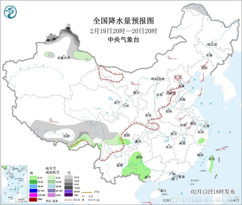 北方降雪在19日晚-20日,主要在新疆北部塔城-阿勒泰一带。21日内蒙古东部降雪增多。21日晚-22日新疆伊犁河谷和天山西段、内蒙古东北部和黑龙江西北部可能有大雪-暴雪。而且22日白天开始,贵州湖南广西的降雨也会增多。23-24日在冷暖空气交汇下,黄河以南还有大范围雨雪。