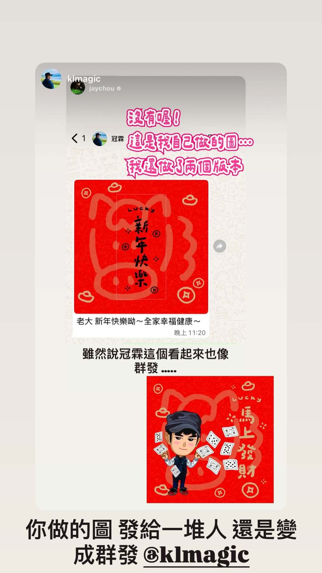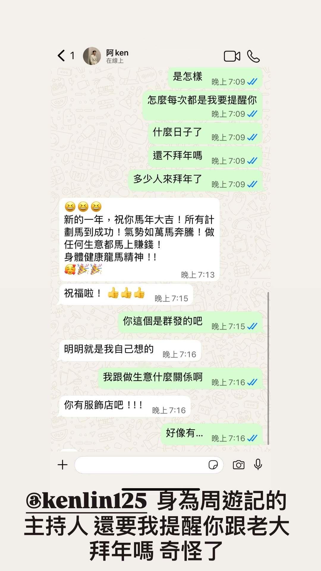 杰伦:身为周游记的主持人 还要我提醒你跟老大拜年吗 奇怪了 人家周游记的其他人 冠霖 罐头 杜哥 刘教练 都不用提醒 为什么我要提醒你呢 虽然说冠霖这个看起来也像群发……(冠霖赶紧解释 hahaha