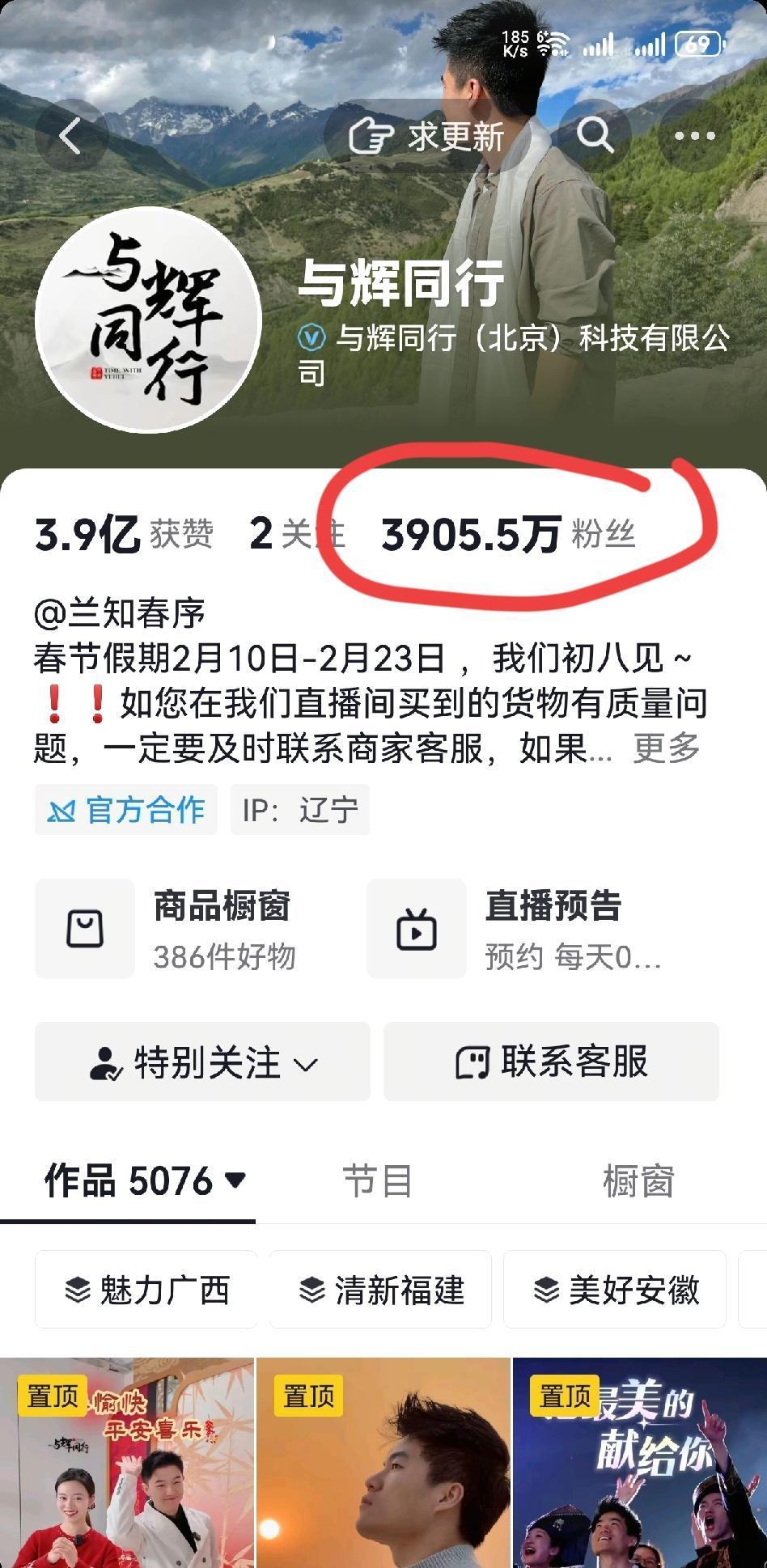 与辉同行粉丝数突破3,911万以后就一直在掉粉。 春节提前一周放长假,没有在线直播,掉粉的速度加快,至今日3,905万,实在让人不爽。 这在与辉同行成立以来是从来没有过的事情,背后的黑手就是以某浪财经为首的这种被包养的网络媒体。他们罔顾事实,黑白颠倒,刻意拉踩,为了黑董宇黑而黑。黄油鸡,春联事件,同时出现上千篇一模一样的通稿,据说一篇黑稿的报酬达到5000以上。 这就像曾参杀人,谎言传了1000遍,亲妈也不相信自己的儿子清白了。这些取关的人,也着实可悲,211同学这个沐光而行的群体,不需要这些没连基本的认知和判断力都没有的人加入。 停播和掉粉,也不能阻止与辉同行直播间的橱窗每天卖出千万元以上的货品,这份独一无二的信任,靠的是真诚和品质维系。