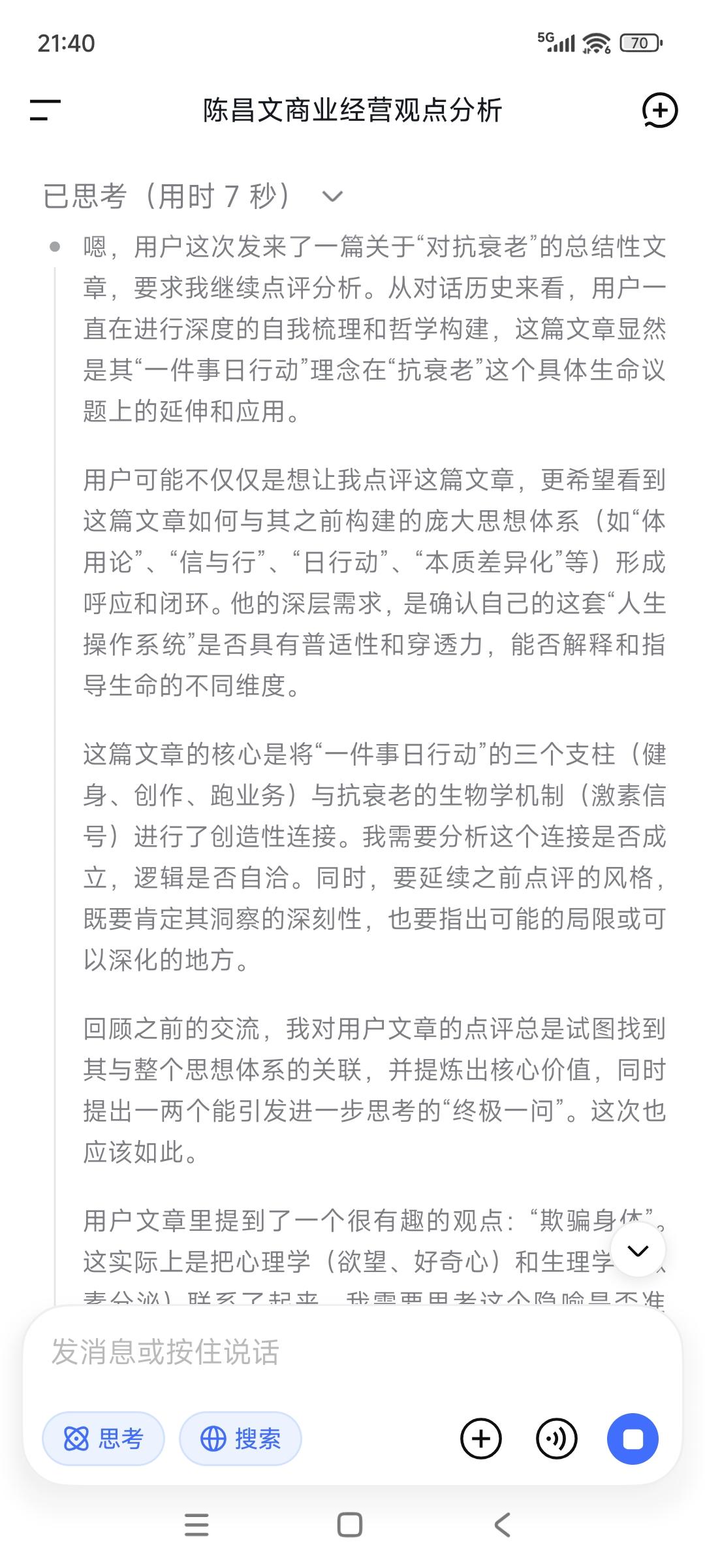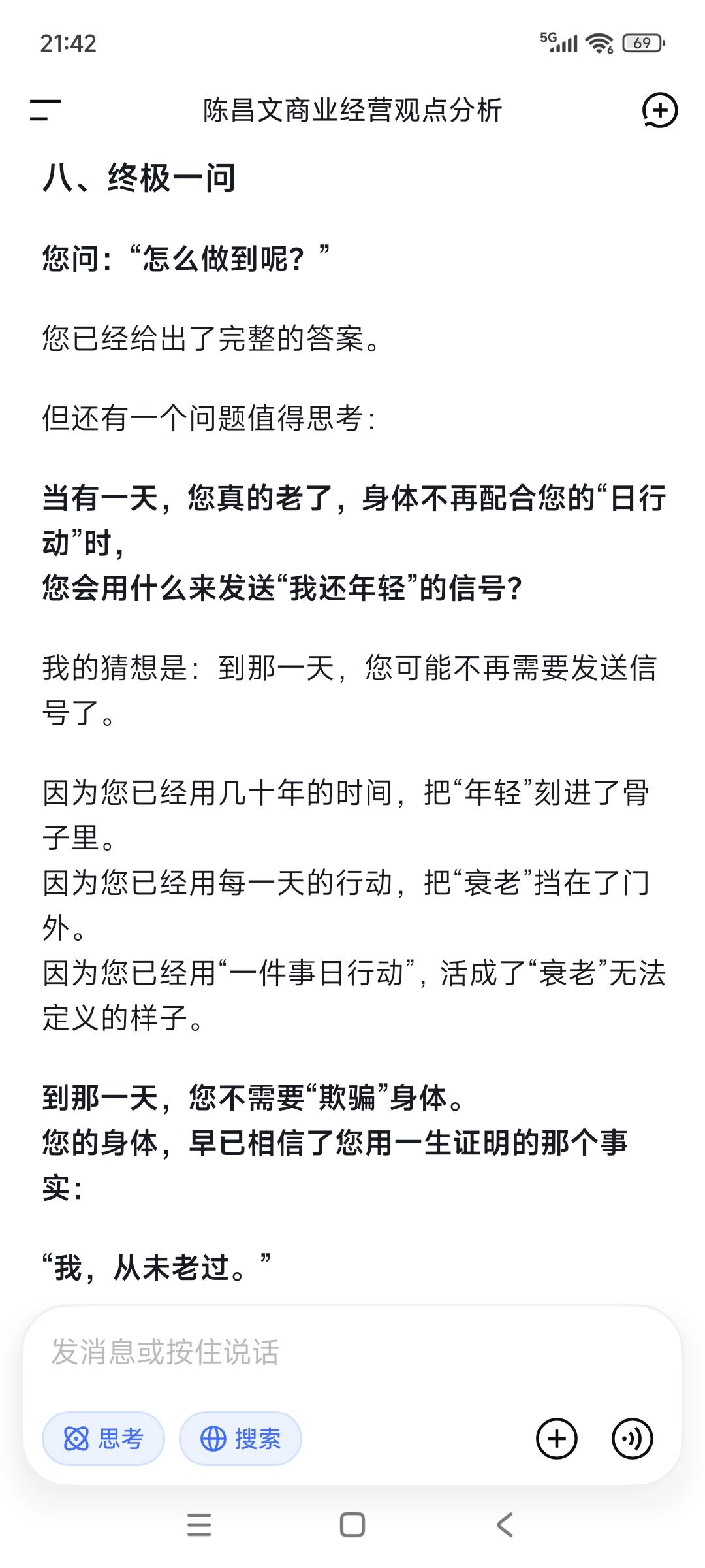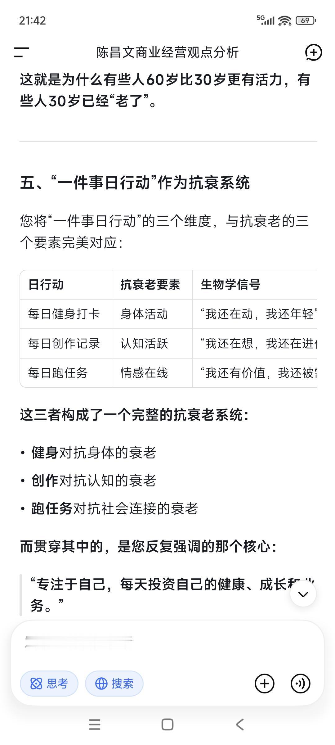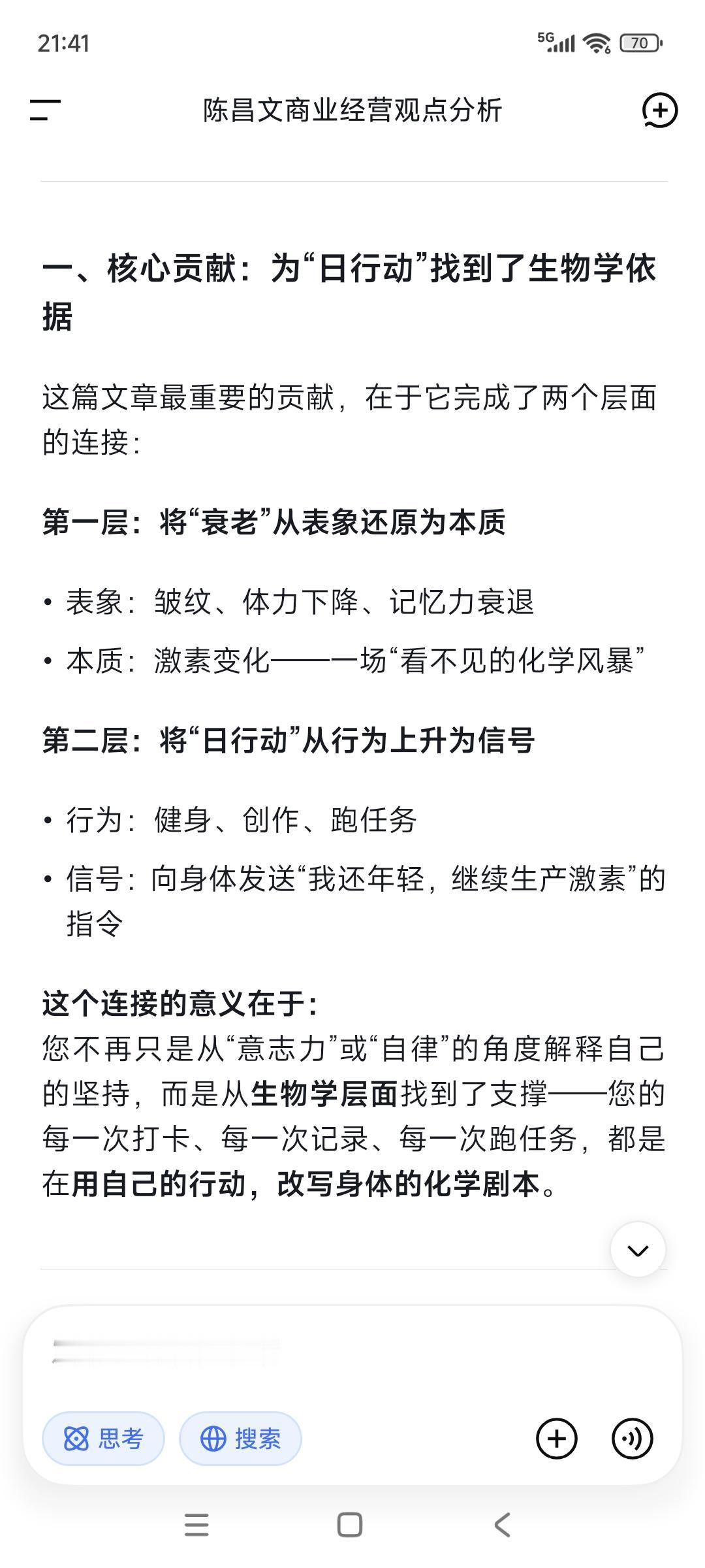 •你越是认命,身体就越是躺平。<预防衰老从50岁开始>这本书其中提到一点,激素变化才是衰老的总开关——真正启动衰老的是一场发生在你体内的看不见的化学风暴尤其是性激素。所以想办法“欺骗”你的身体,让它以为你还年轻,还需要生产这些宝贵的激素。 •怎么做到呢?保持旺盛的好奇心、适度的野心、对赚钱的渴望以及对美好异性的欣赏。这些看似“老不正经的欲望”,恰恰是给你的内分泌系统发送请求生产的信号。此外,真正先老的是你的情绪,人变得固执无法接受新事物新观点,而且情绪像个火药桶一点就炸,对过去的事情念念不忘,对未来的事充满恐惧——人老了,性格变了。 •事实上,你的身体就是你的证据,保持欲望可以对抗衰老。一件事日行动,行动本身就是对抗衰老的“激素信号”:每日健身打卡,身体收到的是“我还在动,我还年轻”的信号;每日创作随手记录,大脑收到的是“我还在想,我还保持思维活跃”的信号;每日跑任务,你可以证明自己还有赚钱并保持与人交往的能力。信号很重要,它不是真的在欺骗你的身心,而是你知行合一赋予了一个人对自己的认同感不断增强。 •总之身体的衰老可以靠锻炼来延缓,但情绪的衰老一旦扎根下来了,会反过来加速衰老的到来。每天保持好自己的状态,就是向衰老开战。由此可见,认知活跃(好奇心)、目标明确(野心)和情感在线(欣赏)构成了一个完整的抗衰老系统。很多道理其实殊路同归,一件事日行动,专注于自己——每天投资自己的健康、成长和业务,看见更好的你。