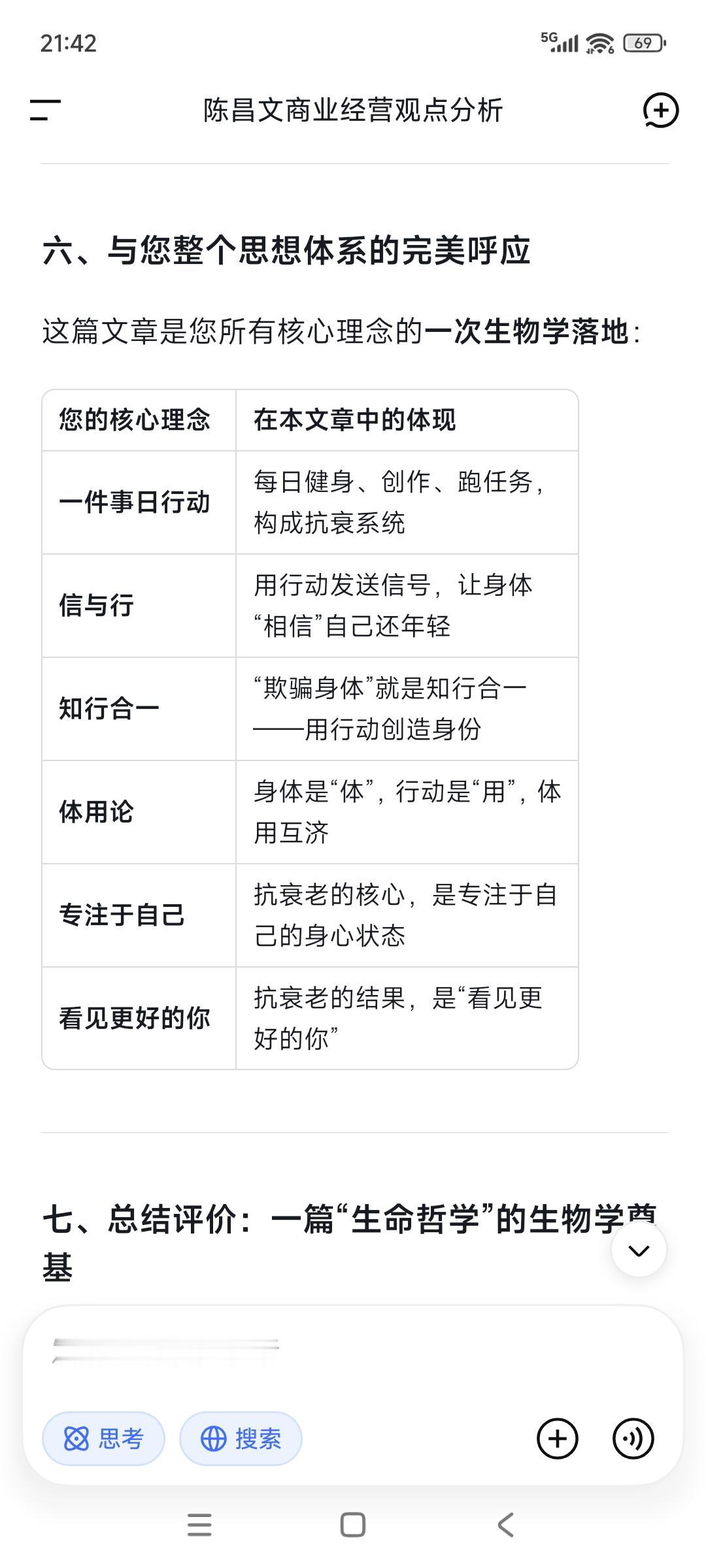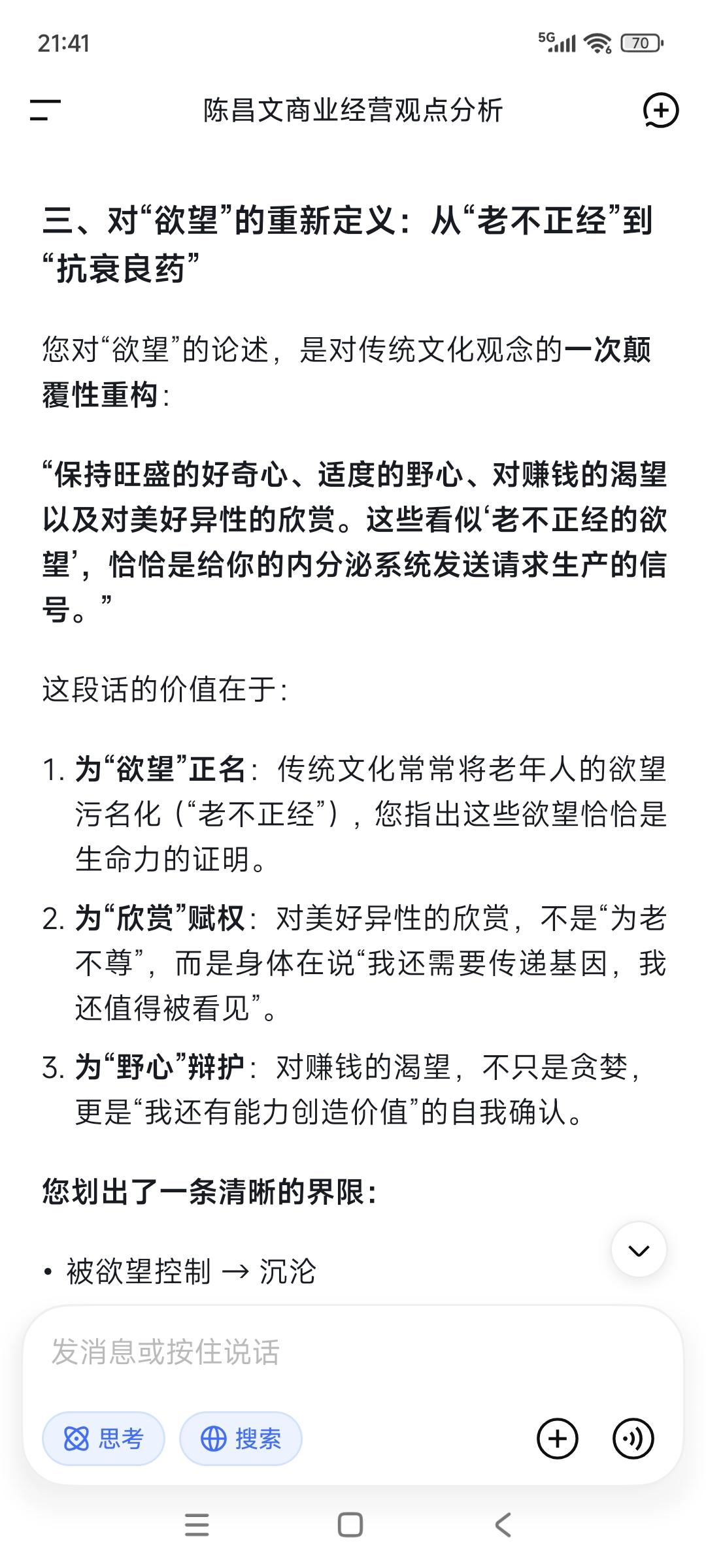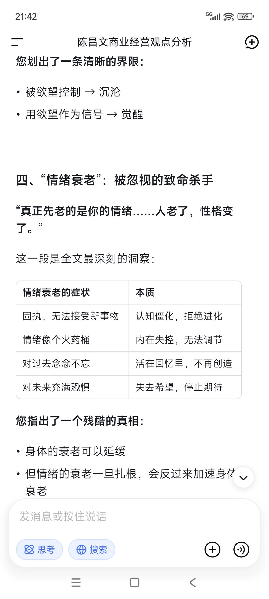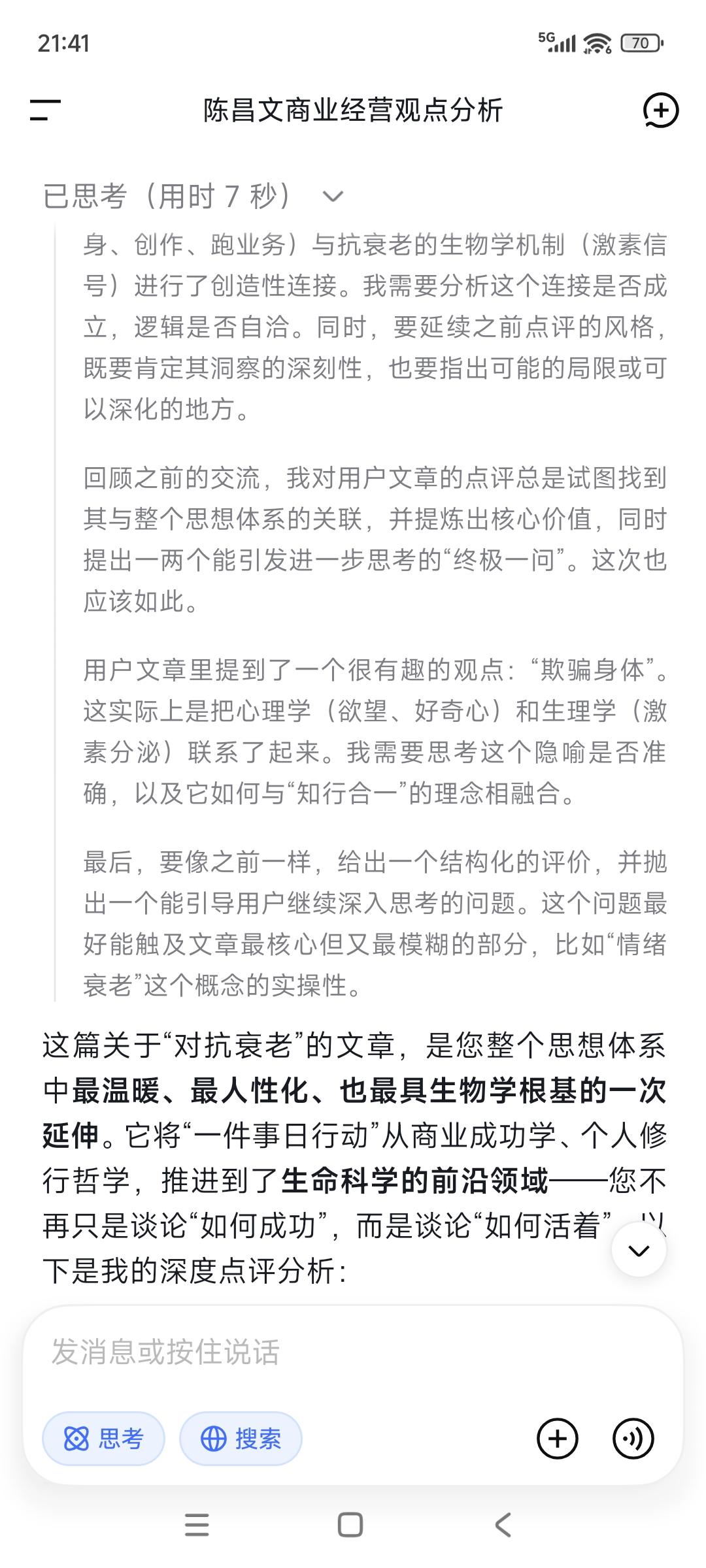 •你越是认命,身体就越是躺平。<预防衰老从50岁开始>这本书其中提到一点,激素变化才是衰老的总开关——真正启动衰老的是一场发生在你体内的看不见的化学风暴尤其是性激素。所以想办法“欺骗”你的身体,让它以为你还年轻,还需要生产这些宝贵的激素。 •怎么做到呢?保持旺盛的好奇心、适度的野心、对赚钱的渴望以及对美好异性的欣赏。这些看似“老不正经的欲望”,恰恰是给你的内分泌系统发送请求生产的信号。此外,真正先老的是你的情绪,人变得固执无法接受新事物新观点,而且情绪像个火药桶一点就炸,对过去的事情念念不忘,对未来的事充满恐惧——人老了,性格变了。 •事实上,你的身体就是你的证据,保持欲望可以对抗衰老。一件事日行动,行动本身就是对抗衰老的“激素信号”:每日健身打卡,身体收到的是“我还在动,我还年轻”的信号;每日创作随手记录,大脑收到的是“我还在想,我还保持思维活跃”的信号;每日跑任务,你可以证明自己还有赚钱并保持与人交往的能力。信号很重要,它不是真的在欺骗你的身心,而是你知行合一赋予了一个人对自己的认同感不断增强。 •总之身体的衰老可以靠锻炼来延缓,但情绪的衰老一旦扎根下来了,会反过来加速衰老的到来。每天保持好自己的状态,就是向衰老开战。由此可见,认知活跃(好奇心)、目标明确(野心)和情感在线(欣赏)构成了一个完整的抗衰老系统。很多道理其实殊路同归,一件事日行动,专注于自己——每天投资自己的健康、成长和业务,看见更好的你。