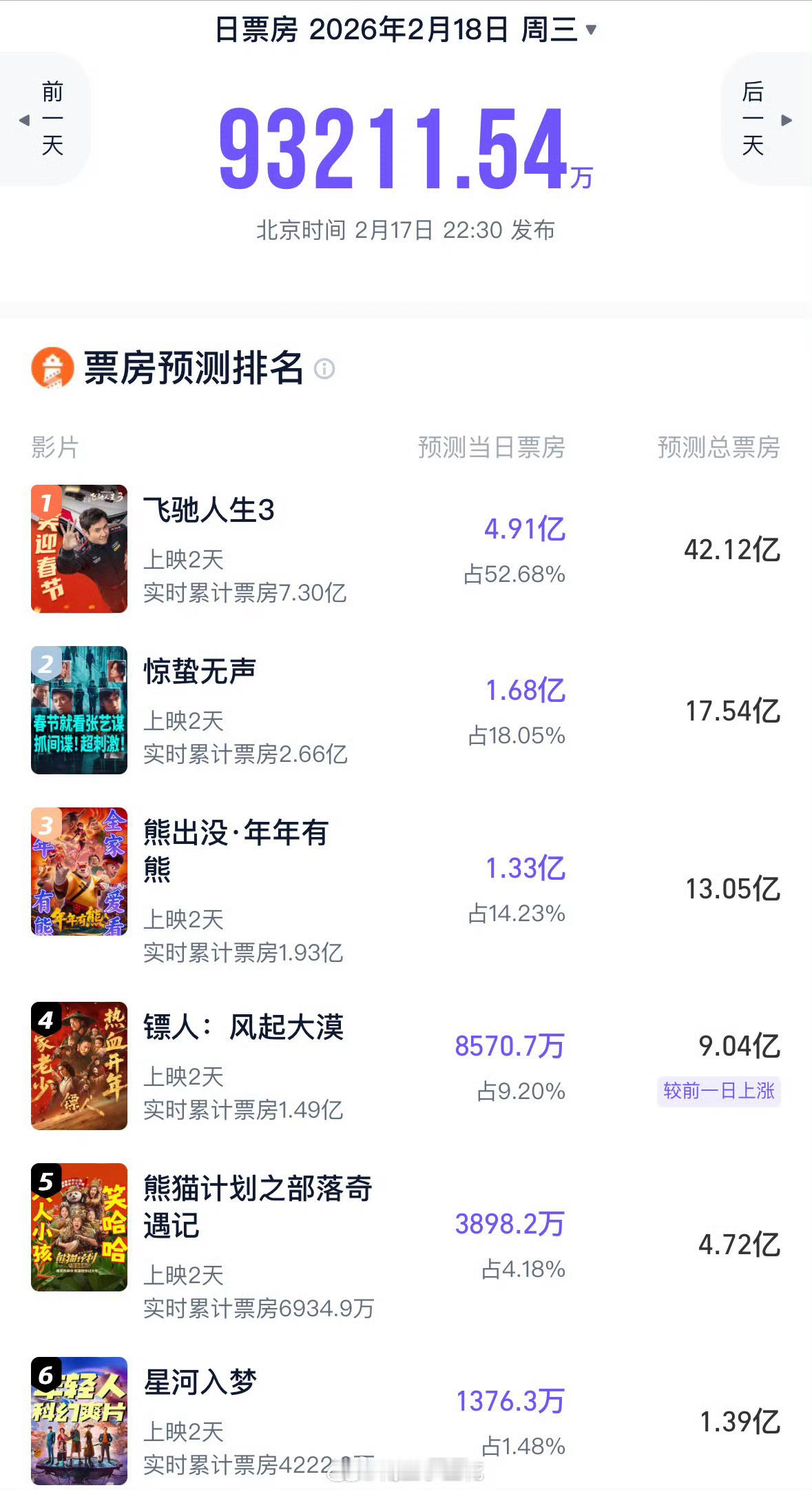 飞驰人生3票房春节档电影上映后票房预测更新《飞驰人生3》猫50亿,淘42亿《惊蛰无声》猫15.9亿,淘17.5亿《熊出没 年年有熊》猫12亿,淘13亿《镖人 风起大漠》猫9亿 ,淘9亿《熊猫计划》猫5亿,淘4.7亿《星河入梦》猫1.25亿,淘1.39亿