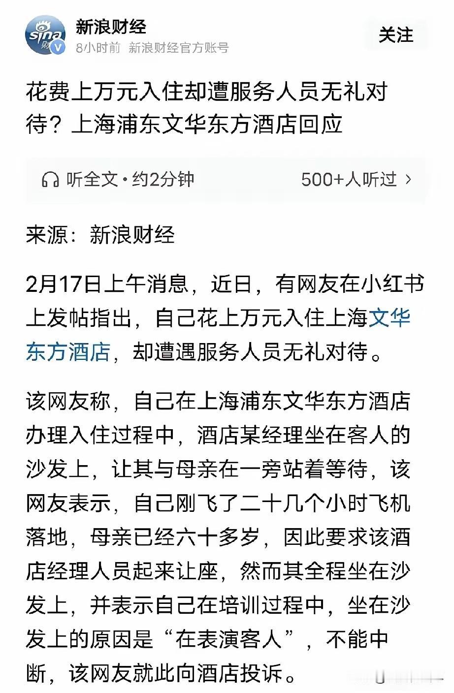 “必须严惩!”上海,女子坐了20几个小时飞机,带着60多岁老母亲,花了上万元入住豪华酒店,办理入住时,酒店经理坐在沙发上,女子让他让座,经理却说:我在培训“表演客人”不能中断,女子火冒三丈,向酒店投诉,得到升级套房,没想到这只是刚开始! 长途飞行后的疲惫往往让人身心俱疲,上海一位女子带着家中长辈出行的遭遇,在网络上引发了不少关注。 这位女子乘坐超过二十小时的长途航班抵达上海,一路上细心照顾着年过六十岁的母亲,长时间的空中行程让母女二人都感到十分劳累, 为了让旅途后半段更加舒适安心,她特意花费上万元选择入住当地一家豪华酒店,希望能够在专业的服务中得到充分休息,缓解一路奔波带来的疲倦。 来到酒店大堂办理入住手续时,女子和母亲已经处于长时间奔波后的疲惫状态,年迈的母亲更是难以长时间站立,身体状态需要及时坐下休息。 此时酒店的一名管理人员正坐在大堂内的公共沙发区域,没有参与正常的接待工作,也没有为到店客人提供相应的引导服务。 女子看到沙发区域被占用,便希望对方能够暂时起身,让自己的母亲能够落座缓解疲劳,可这名管理人员并没有起身配合,依旧保持原本的状态停留在沙发区域, 并且以自身正在参与内部培训、模拟扮演客人为由,拒绝中断当前的流程,也没有为母女二人寻找其他可以休息的位置。 持续的疲惫与被忽视的感受叠加在一起,让女子对酒店的服务产生了强烈不满,她随即向酒店方面提出正式投诉,要求对现场发生的情况进行处理。 酒店在收到投诉后,为了平息不满,将女子原本预订的房型免费升级为套房,以此作为初步的补偿方式。 可此前坐在沙发上的管理人员并没有意识到服务中存在的问题,不仅没有主动向女子表达歉意,还继续与女子进行沟通,坚持自己当时的行为属于正常工作培训范畴,始终不肯为现场的疏忽做出道歉。 事情并没有在房型升级后得到解决,反而因为后续的处理方式引发了更多矛盾。第二天,酒店安排了另一位管理人员出面与女子沟通,这位管理人员正式向女子表达了歉意, 同时提出额外补偿酒店内的餐饮套餐,承诺为母女二人提供免费用餐的服务,以此弥补此前不愉快的入住体验。女子接受了酒店的道歉与补偿方案,随后按照约定前往酒店餐厅用餐。 当母女二人用餐结束准备按照承诺办理免单手续时,餐厅工作人员却临时告知,此次免单存在明确的金额限制,每位客人只能免除五百元以内的消费金额,超出规定额度的部分需要由女子自行承担。 这一事先并未告知的限制条件,让女子再次感到难以接受,此前沟通时并没有提及任何额度约束,临时增加规则的做法让她觉得酒店处理问题缺乏诚意。 从长途奔波抵达酒店后的入座需求被忽视,到投诉后涉事人员拒绝道歉,再到餐饮补偿承诺不清晰、临时设置消费限额,一连串不顺畅的处理过程, 让原本高品质的入住期待彻底落空,全程的服务体验不断下降,每一步的沟通与解决方式都让原本简单的问题变得更加复杂,也让一次原本放松的出行变成了充满困扰的经历。 对此,你们有什么看法,欢迎评论留言~