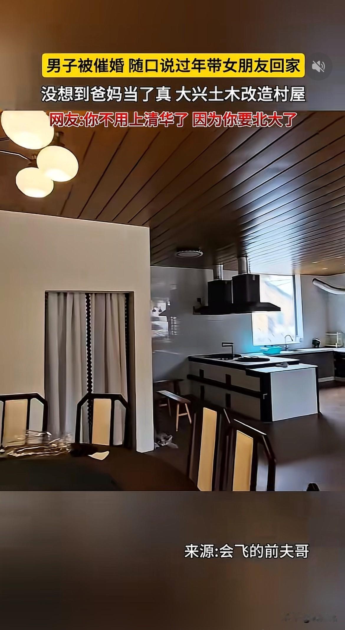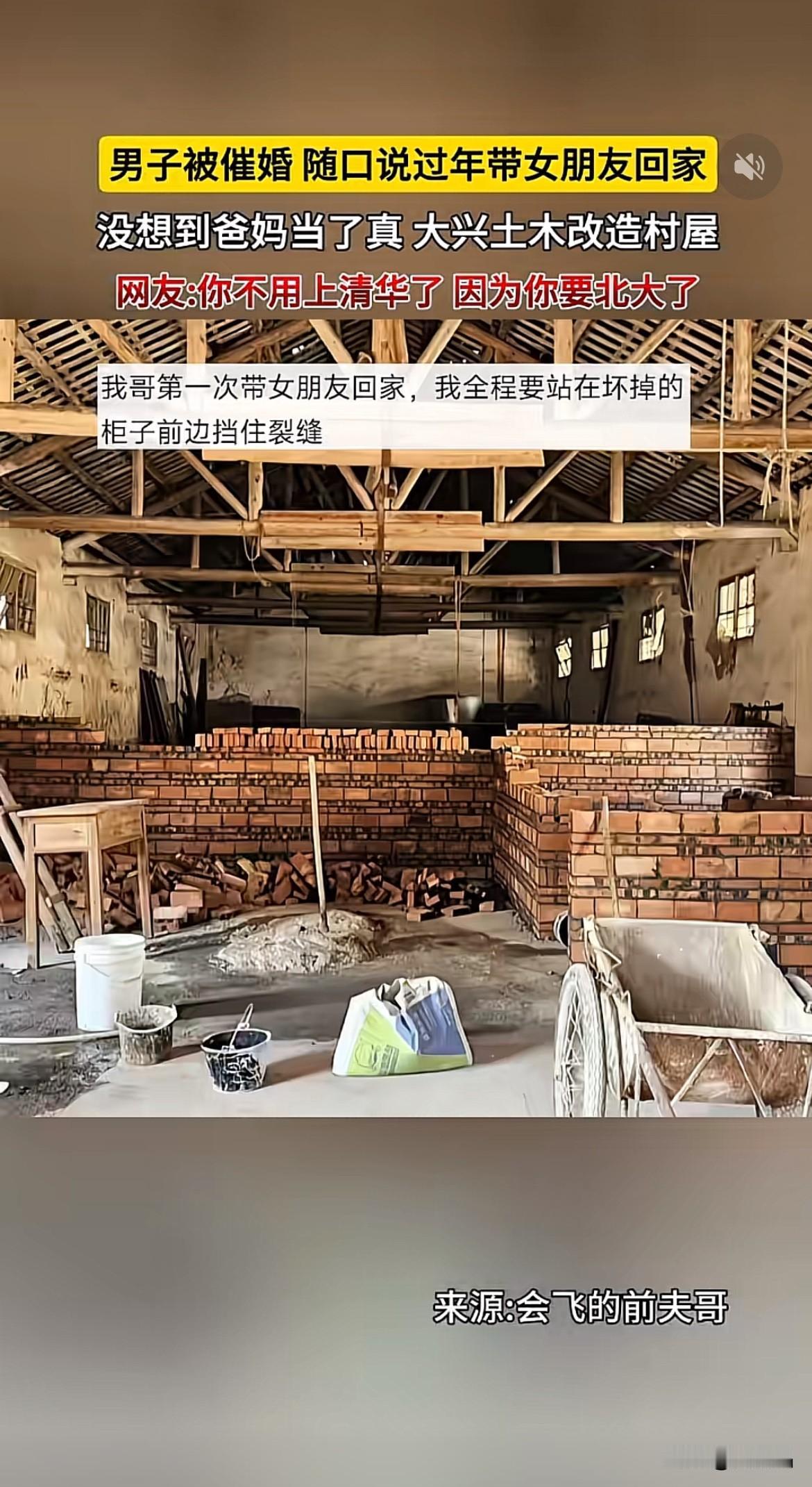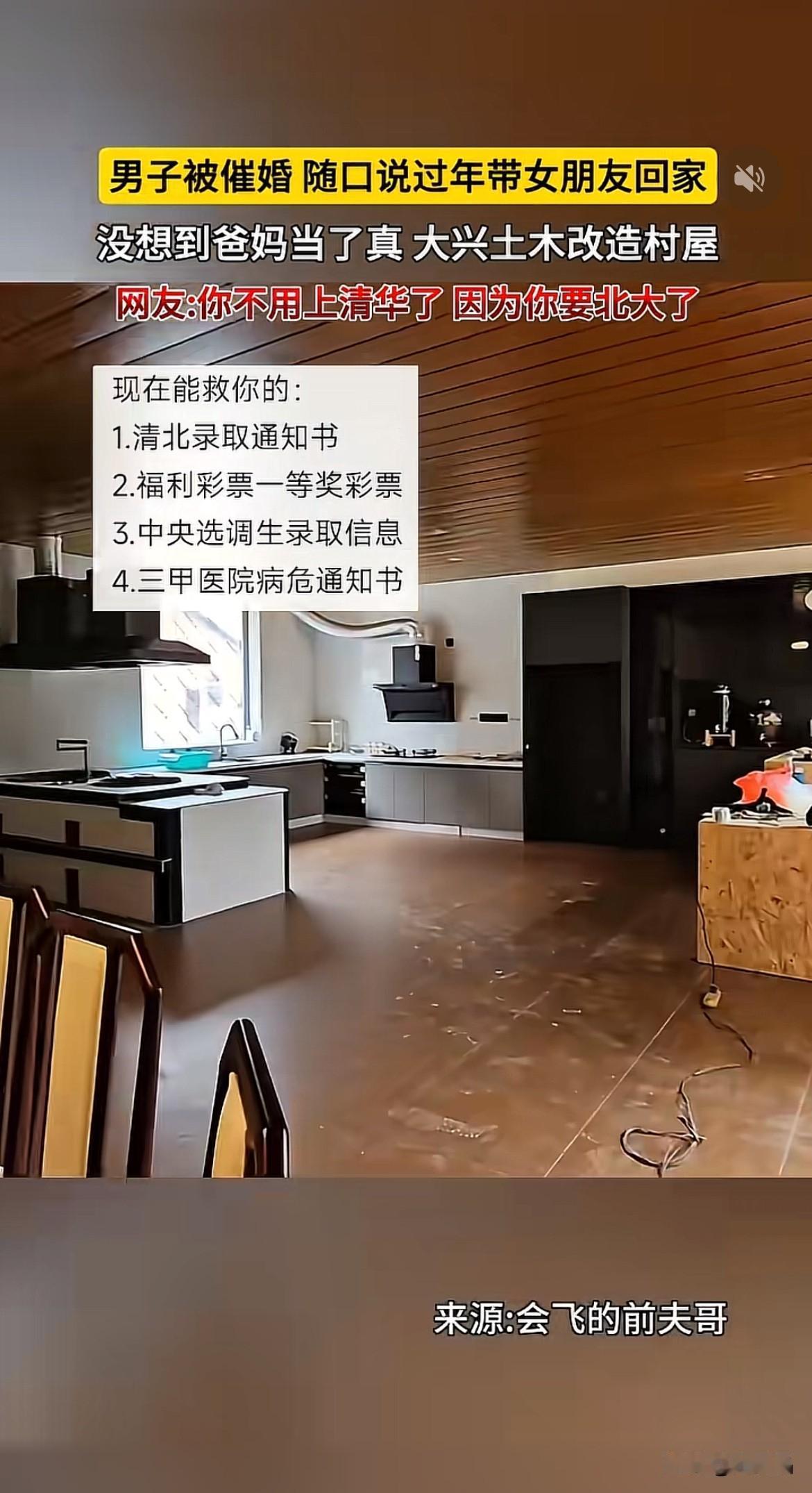 笑不活了!湖南,一男子被催婚,随口说带女朋友回家过年,没想到父母当真了,第二天就大兴土木,动工改造村屋。网友调侃只有这四个才救得了你。 12月份,男子和妈妈视频时,妈妈催婚:“你也老大不小了,什么时候找女朋友?别人家的孩子都可以打酱油了,” 男子不厌其烦,敷衍妈妈:“别担心,我过年就带女朋友回家。” 父母一听太高兴了,想着儿子带女朋友回家过年了,家里房子这么旧,怕是会吓跑人家。 没想到父母第二天就开始动工,找来施工队,对旧村屋进行大改造,赶在过年前就装修好了,旧房瞬间翻新成现代化大房子。 男子慌了,说不敢回家过年,怕被父母打。网友纷纷给男子支招。 现在能救你的是:1.清华北大录取通知书 2.福利彩票一等奖 3.中央选调生录取信息 4.三甲医院病危通知书。 还有网友让男子租个女友回家过年,不得不说,网友的招数又损又搞笑,男子现在骑虎难下了,不知道他会怎么蒙混过关,还是真的鼓起勇气找个女友回家。 其实父母催婚是想孩子有人爱,有人陪伴,租女友这事不可取,还不如跟父母坦诚相待,实在找不到,就让父母帮忙安排相亲,找个知根知底的伴侣也不错。