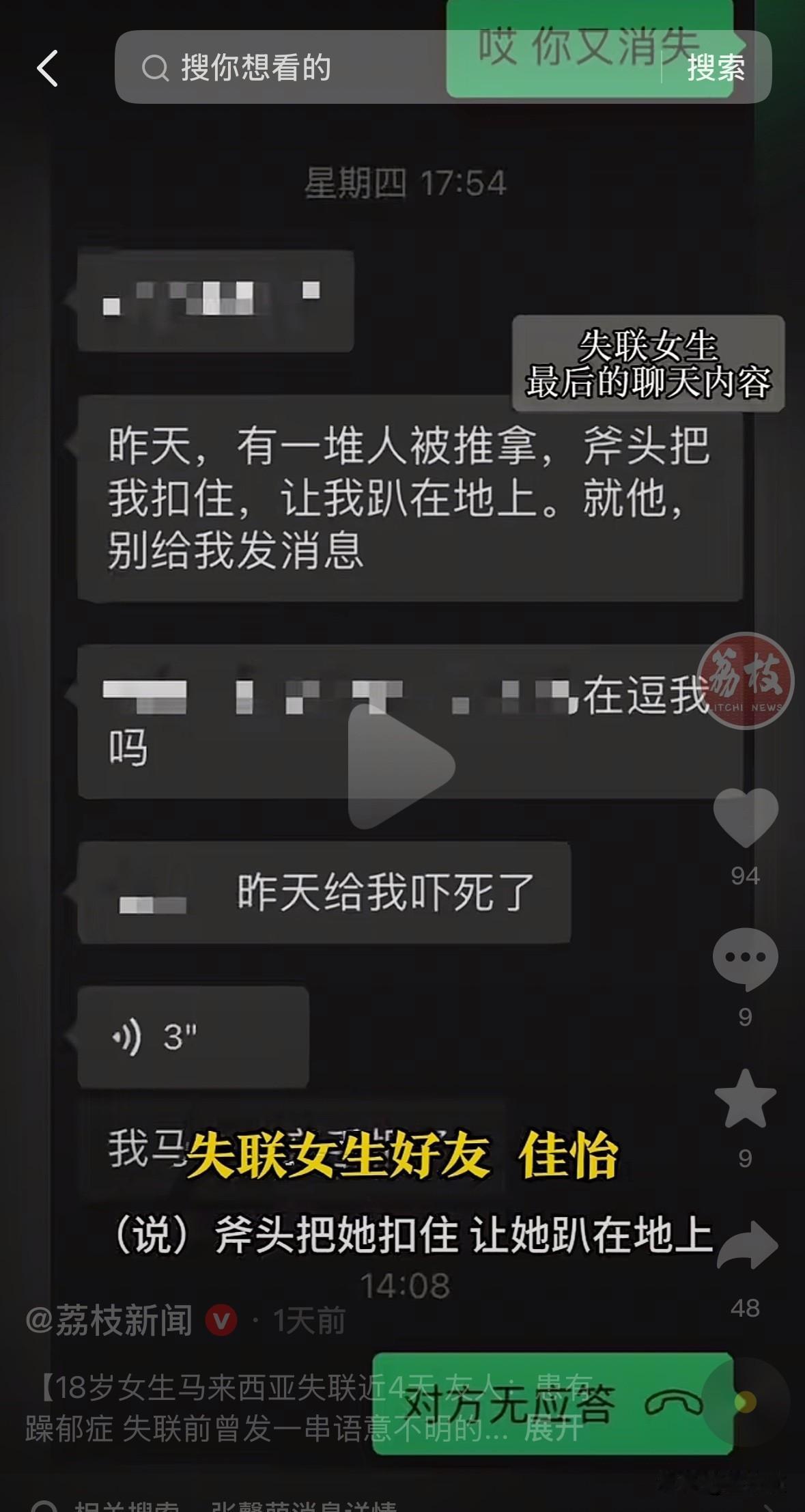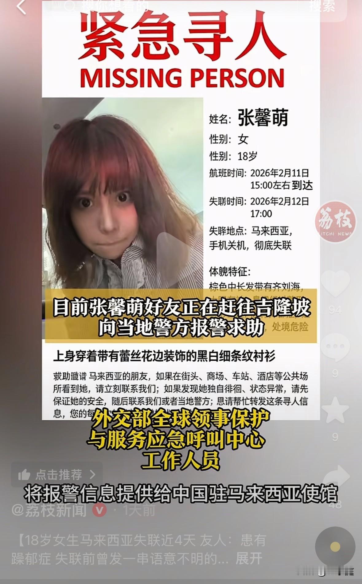 这个年仅18岁的女孩,终究是大意了。她2月11日从深圳飞往马来西亚,可仅仅一天后她就失联了!更让人匪夷所思的是:她失去联系前,还发了几句莫名其妙的话给自己的好朋友,自此,手机也打不通了! 这个女孩名叫萌萌,天津人。她自小生活在一个单亲家庭里面,跟随着父亲和继母长大。 在本该最美好的年华里,萌萌不幸患上了双向情感障碍。她曾跟自己的好朋友倾述,自己已经跟家里断绝了关系…… 在大家都纷纷回家和家人共度春节的时间里,萌萌却给自己安排了一趟并不一样的旅程:她计划独自飞往马来西亚。 2月11日,她从深圳宝安机场出发,当天下午3点多落地马来西亚。 本以为这是一趟愉快的旅程,不料,却事与愿违。 2月12日下午五点多,萌萌的好朋友突然收到了她从马来西亚发来的几条信息,对话框里的内容让对方一头雾水,且非常担心。 正在其好友不知所措的时候,萌萌就彻底失去了联系,因为她的手机已经关机了!目前,好友已经赶往马来西亚寻找她,并且向当地警方报警求助。可截止到现在,仍没有看到事情的相关进展。 2月17日,是我国一年一度的新春佳节,这么美好的日子里,一家人理应坐在一起热热闹闹的一同度过。可萌萌却始终无法联系上,在此,真的不敢想她的父亲该有多么焦急啊? 萌萌才18岁,大过年的她之所以要往外跑,估计和她之前向朋友倾述的内容相关。其实,这个岁数和家里人发生点矛盾也在所难免。只要一家人坐在一起开诚布公好好的沟通,没有什么矛盾是不可以解决的。 最后,愿萌萌平安无事,早点回家![祈祷][祈祷][祈祷]