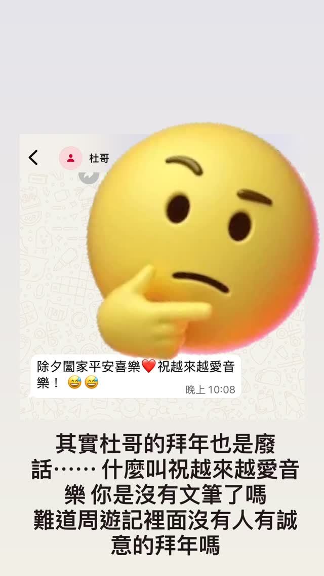 杰伦:我刚稍微看了一下刘教练给我的拜年……其实杜哥的拜年也是废话……什么叫祝越来越爱音乐 你是没有文笔了吗 难道周游记里面没有人有诚意的拜年吗