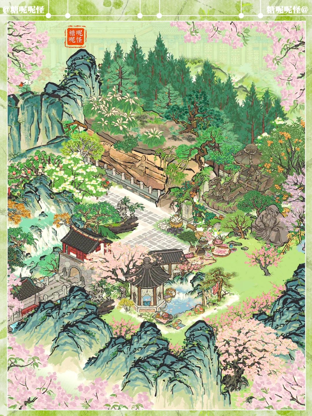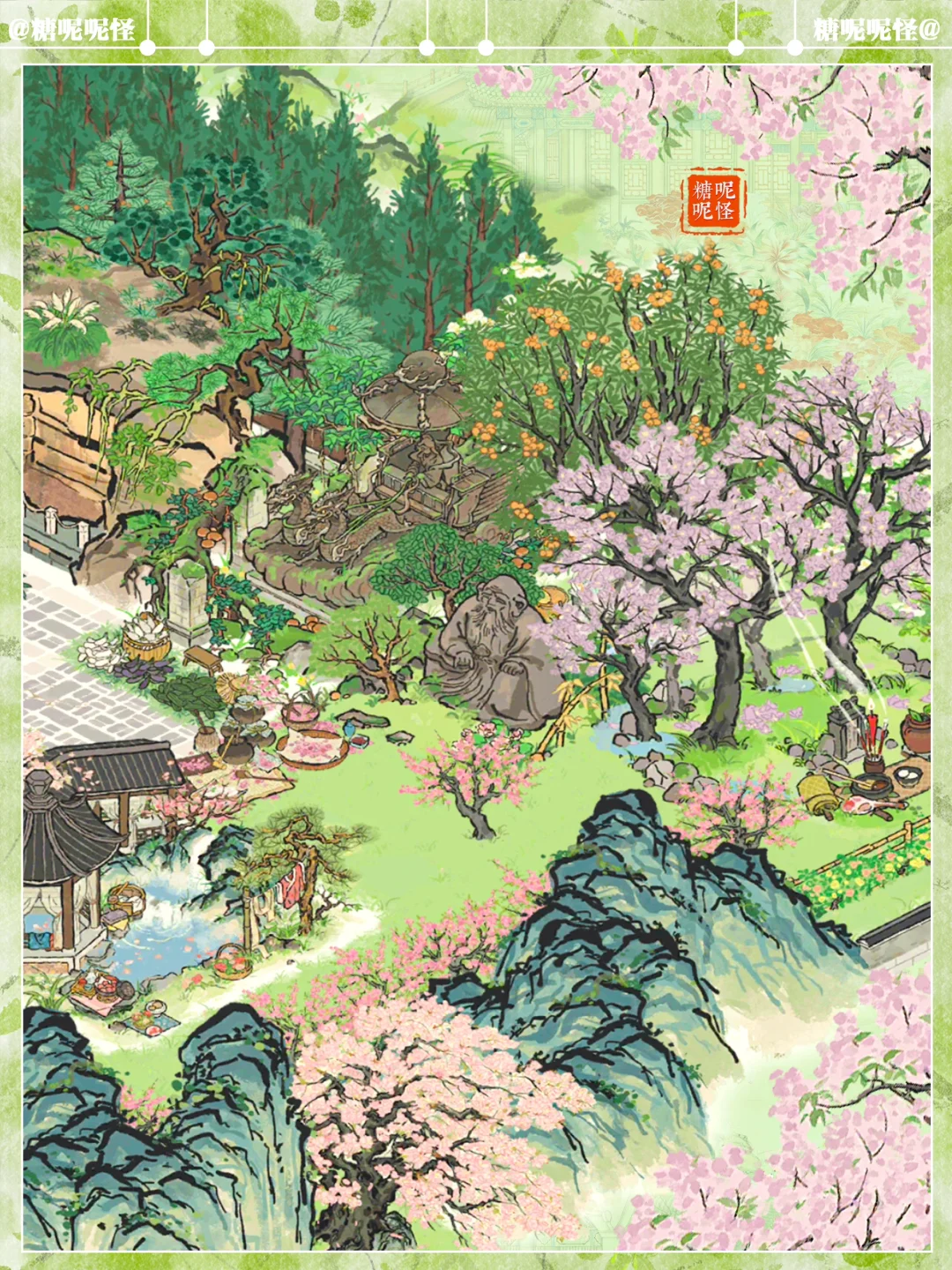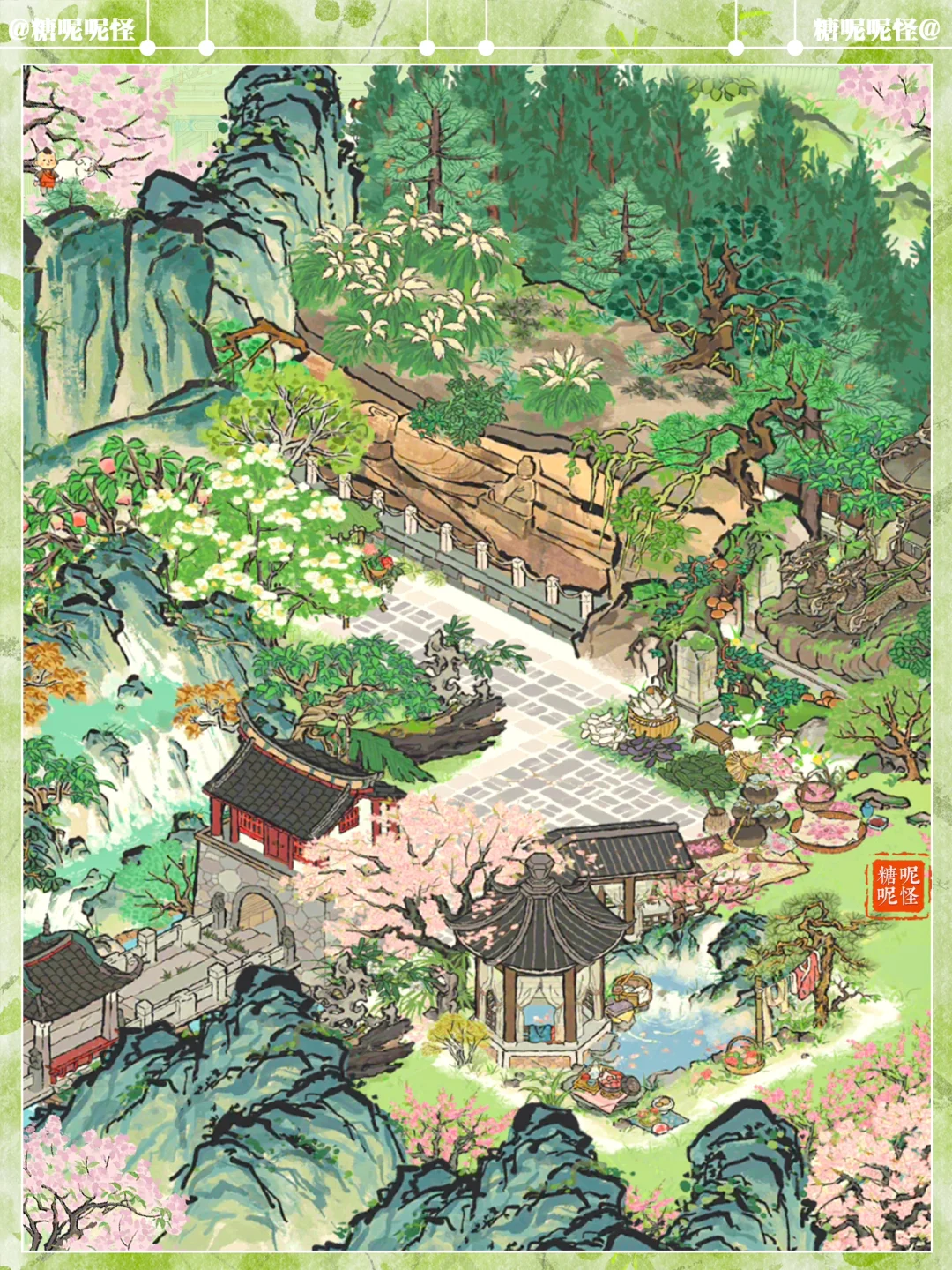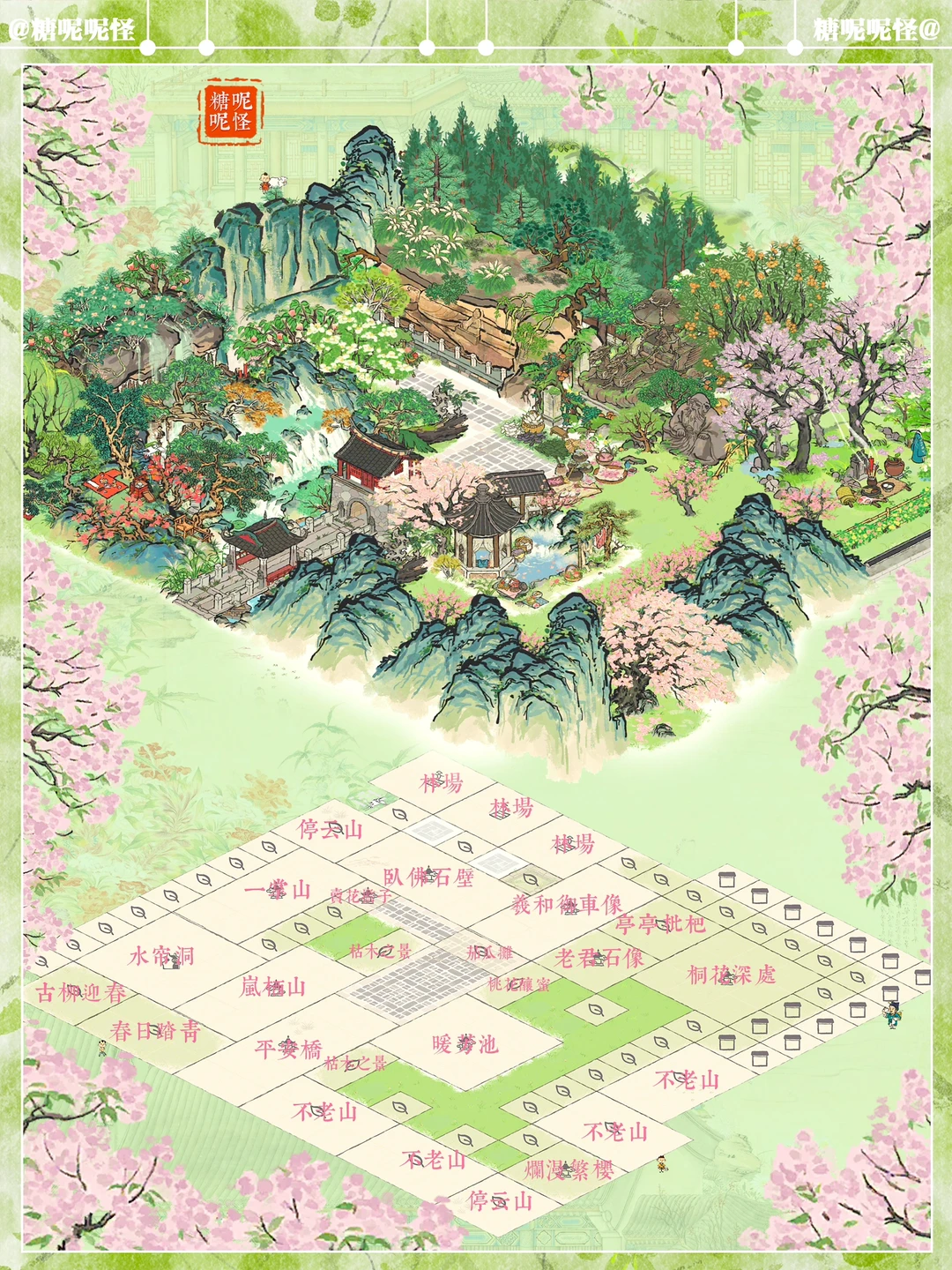 🍀石像合集小布局 🍃穿过平安桥,去往石像景区 ☘️建筑:卧佛石壁|羲和御车像|老君石像|一掌山|平安桥|暖芳池|岚栖山|不老山|伏鹿山|停云山|桐花深处|烂漫繁樱|亭亭枇杷|古柳迎春|春日踏青