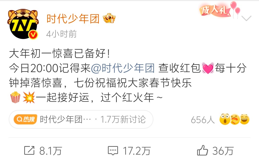 时代少年团官博今晚八点发红包,每十分钟掉落惊喜,应该是七个包,是无门槛还是铁粉啊