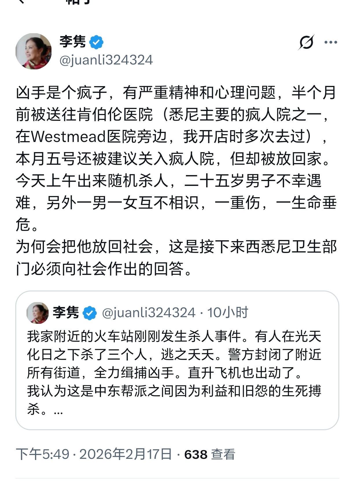 李隽在悉尼的家门口有人杀人,把她吓坏了,在网上发帖