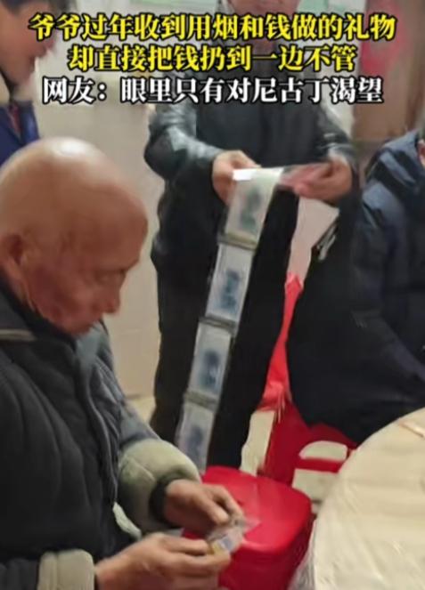 看笑了!一爷爷过年收到用烟和钱做的礼物,却直接把钱扔到一边不管,眼里只有对烟的渴望!这就是老小孩最真实的样子,太可爱了! 那叠钱被他随手扔在一边,与他对烟的痴迷形成鲜明对比。有些老人一辈子的爱好,真的是比钱还亲。 老一辈想要的不是贵重的礼物,是自己真心喜欢的东西。烟是他一辈子的瘾、是他的念想寄托,是他的快乐源泉。钱相对于烟的诱惑力,反而没有那么直观,没那么“过瘾”。 毕竟钱可能是奶奶的,烟才是爷爷自己的。 所以送礼,还得送到点子上,送到对方爱好上,才能让对方开心很久。