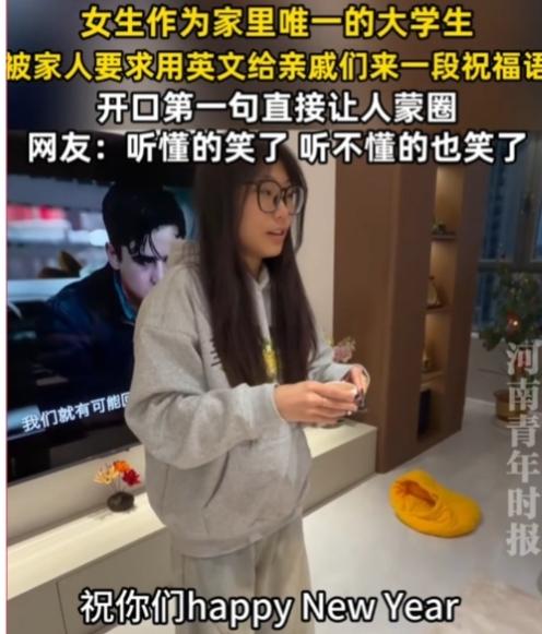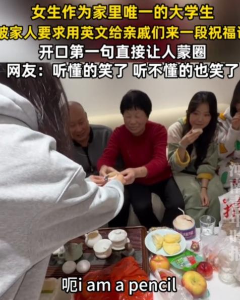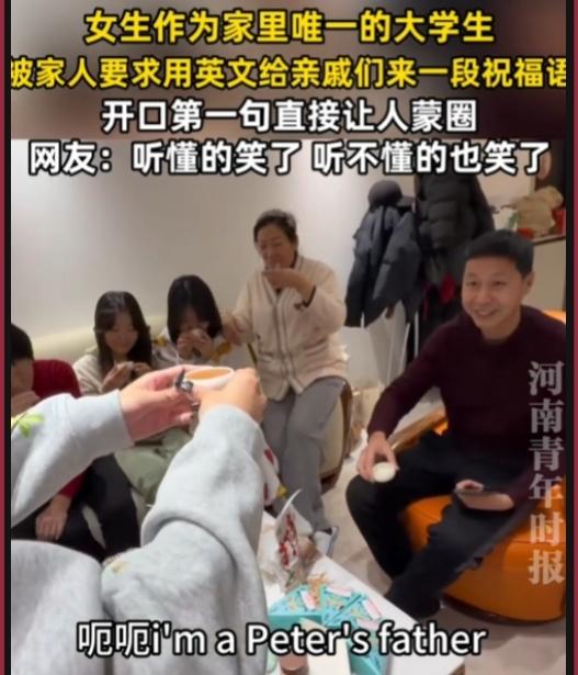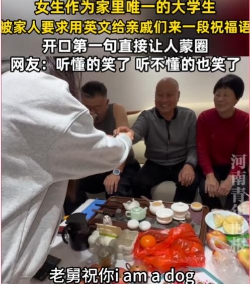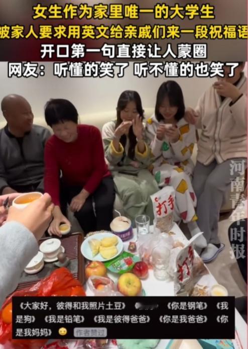 上课要好好学习,否则过年被家人要求用英语说祝福的时候,丢脸的是自己! 一女生因为是家里的唯一大学生,被亲妈要求用英文来段祝福语,让大家羡慕羡慕他们家。 结果……听不懂得笑了,听懂得也笑了! 英转中,翻译:大家好,彼得和我照片的土豆,祝你们新年快乐! 老舅,祝你有个好 大姑,你是一支钢笔 老舅,祝你我是一条狗 大姑,我是一支铅笔 大姑,我是彼得的爸爸 爸爸,你是一个爸爸 妈妈,你是一个妈妈 很神奇的是,怎么还有一个男大姑? 听懂得两老妹儿,可劲得摆手拒绝了,坚决不要女生的祝福。只是一味的喝茶,这是不把嘴堵上怕笑喷了? 最好笑的是女生不会说亲戚那些英文名词都用中文蒙混过去了。看得出来,女生已经尽力了,把上课听进去的词都吐出来了,特别是那个dog! 看吧,书到用时方恨少,词穷到狠起来,连自己都骂!这种祝福语,听得懂应该没谁能接受吧!