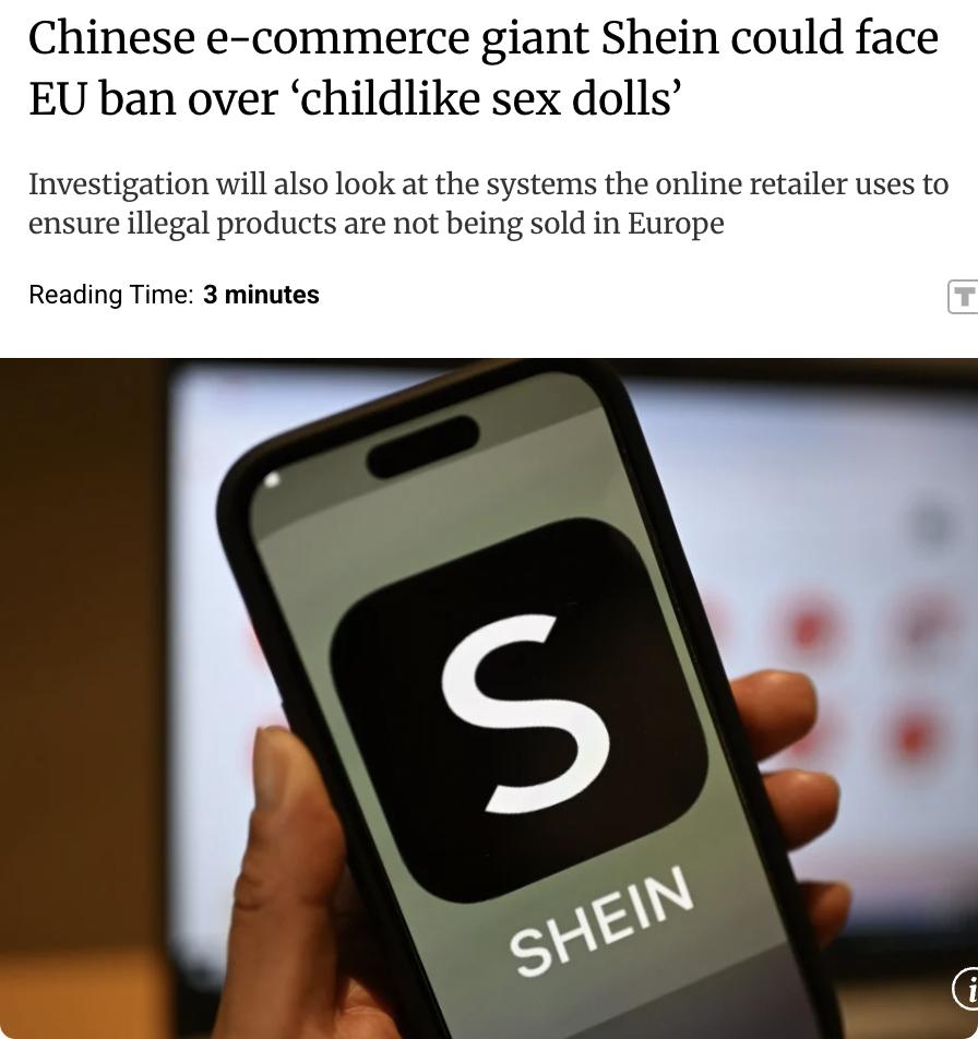 外媒:中国电商巨头希音可能因“儿童性爱玩偶”问题面临欧盟禁售。欧盟委员会根据《数字服务法》启动调查,将审查希音在欧洲的非法产品管控体系,并要求其配合整改。 若希音不配合,可能采取临时执法措施,但企业也可自愿整改。此前希音在法国被暂停运营三个月,后因产品下架,法院取消禁令。 此次调查结果可能影响希音在欧盟的市场地位,但目前尚无明确法律期限。