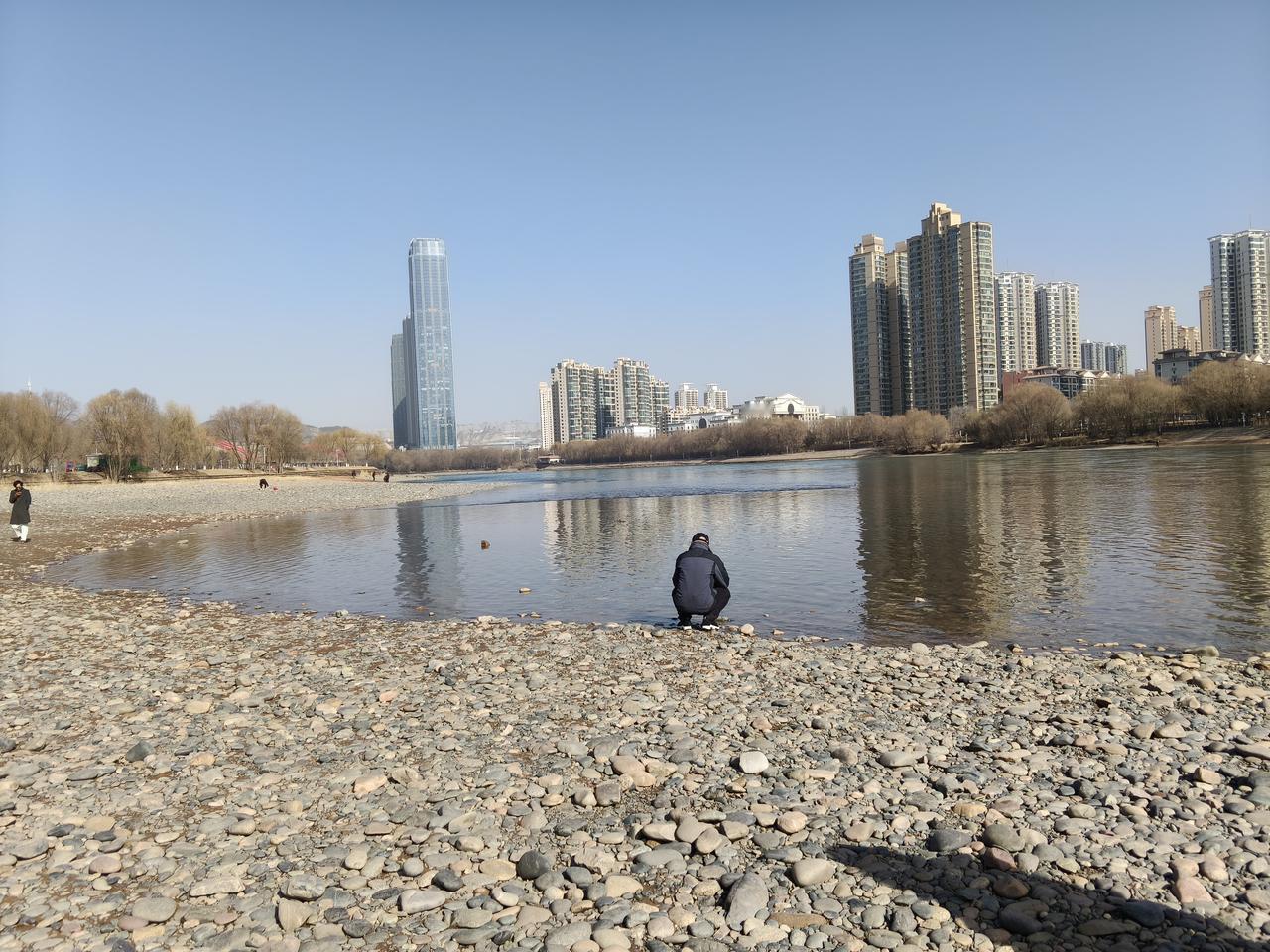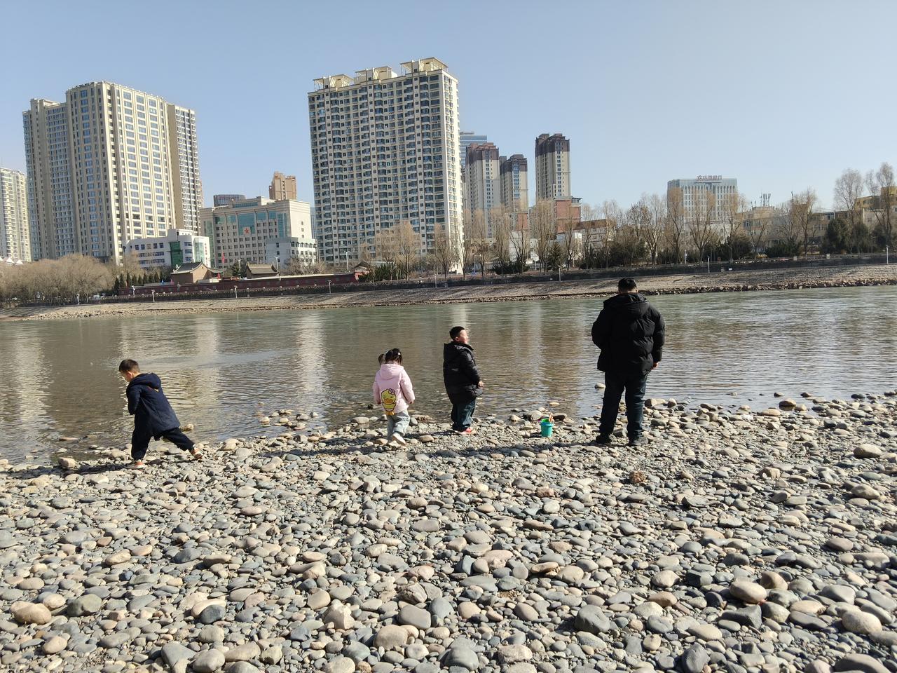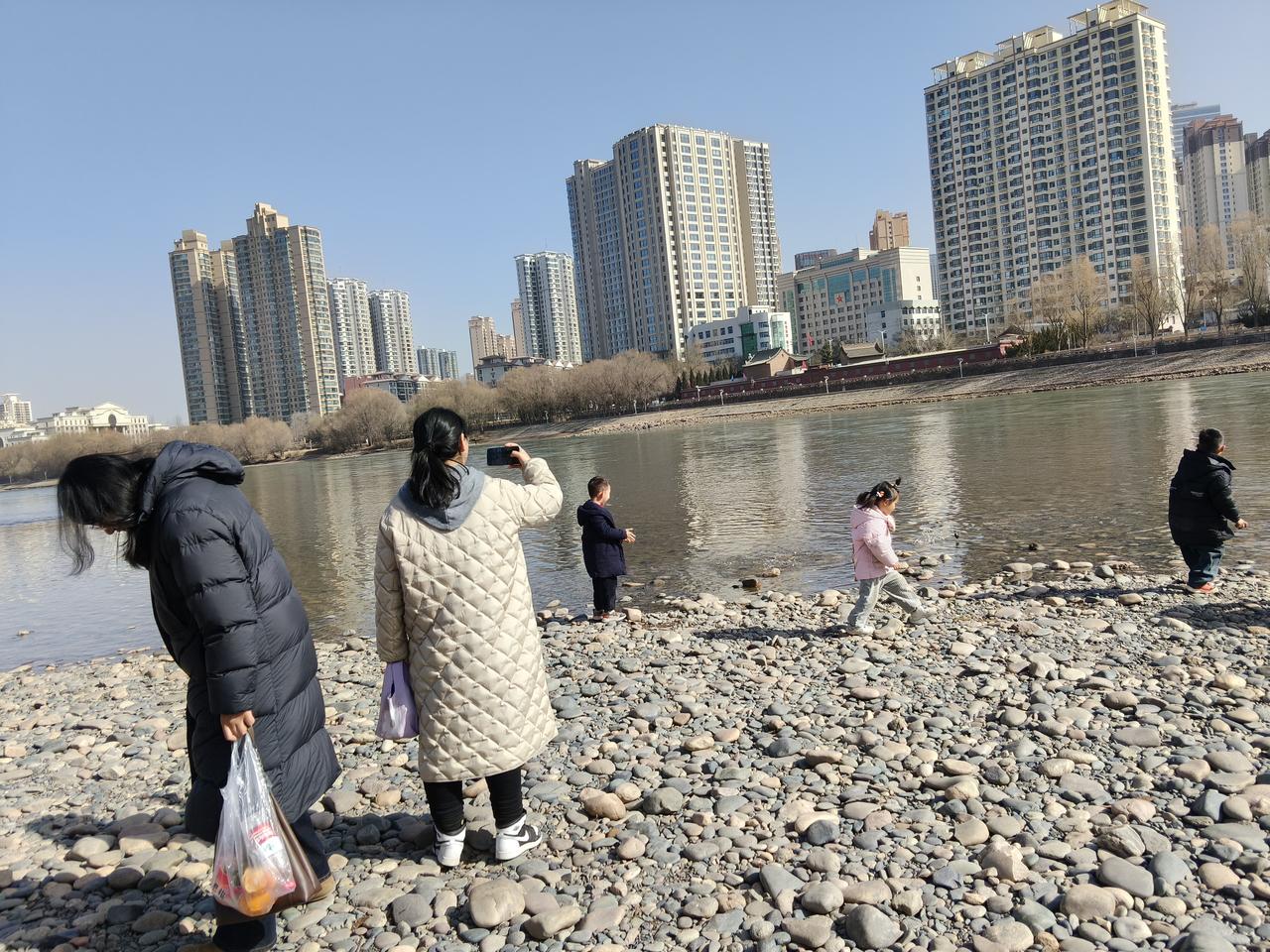而是来到黄河边带着孩子来玩,玩的市民还是挺多的。 过年期间这几天基本上都是晴天,外面天气比较暖和,很多人都脱了外套在黄河边扔石头玩水,还有的冬泳爱好者在黄河里游泳。