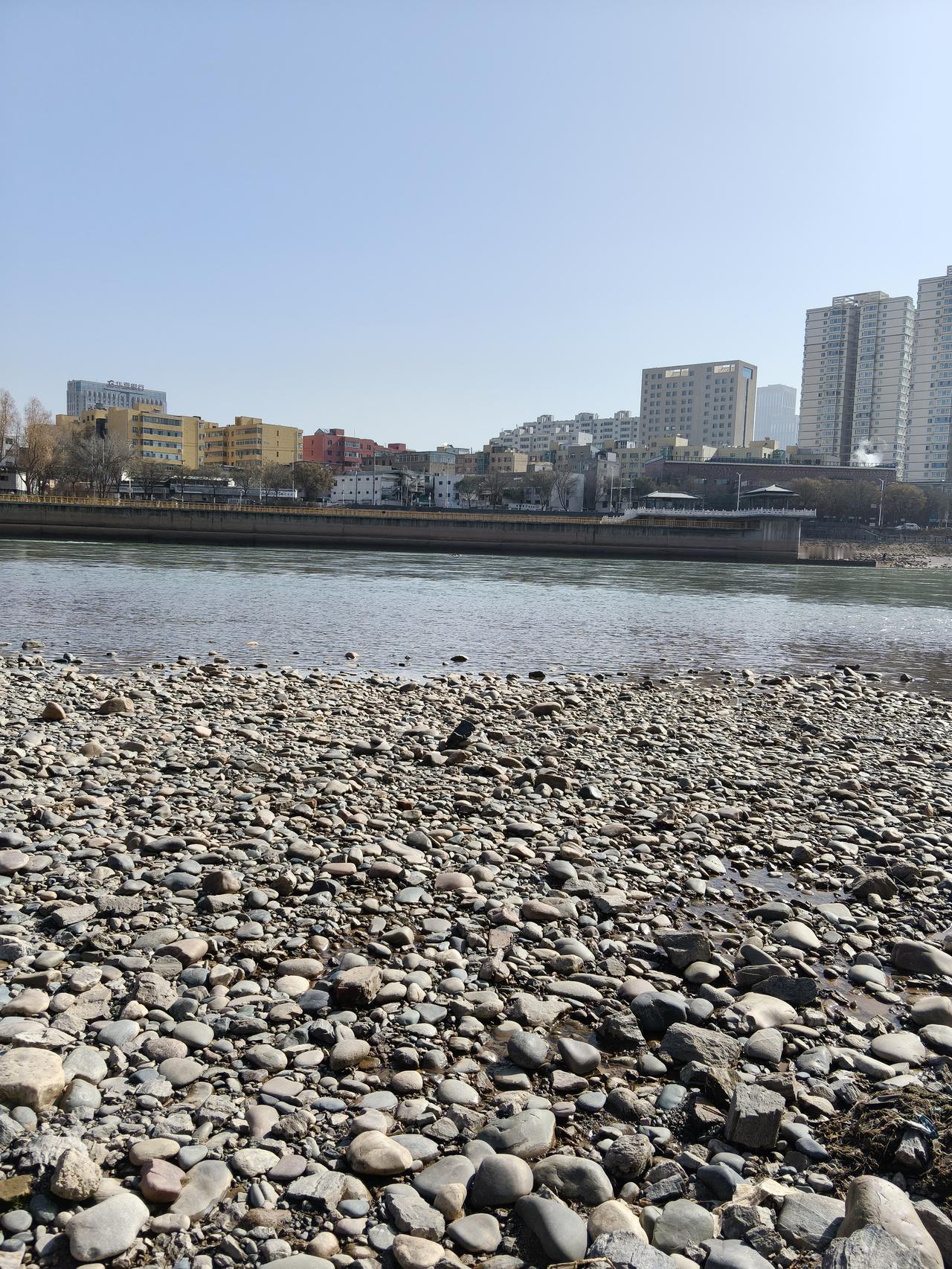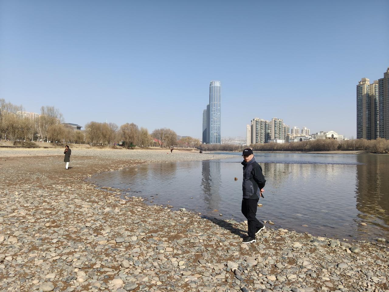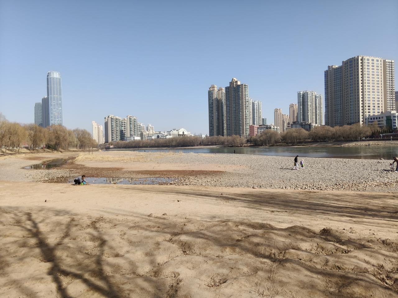 而是来到黄河边带着孩子来玩,玩的市民还是挺多的。 过年期间这几天基本上都是晴天,外面天气比较暖和,很多人都脱了外套在黄河边扔石头玩水,还有的冬泳爱好者在黄河里游泳。