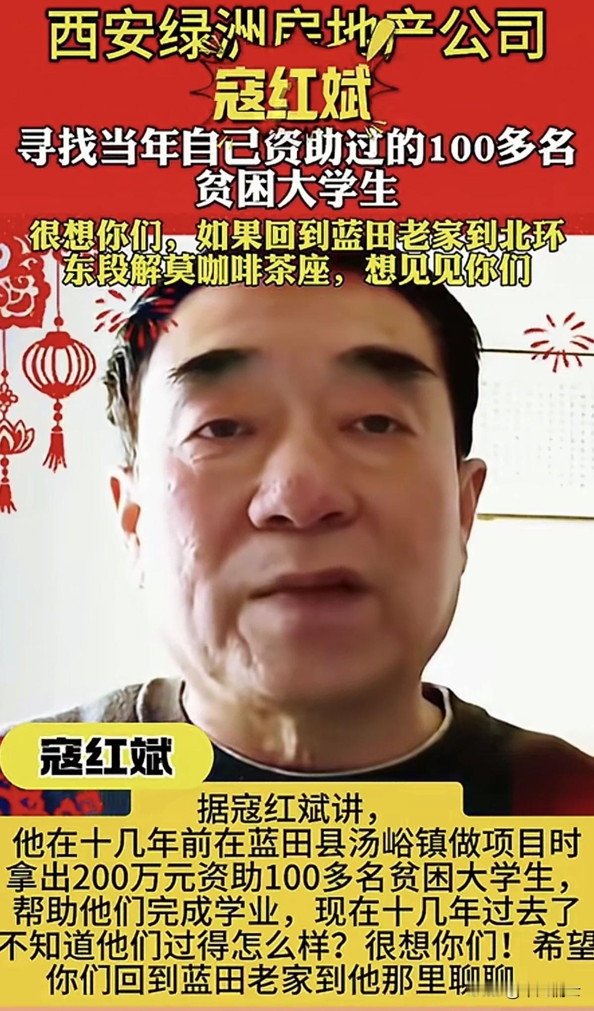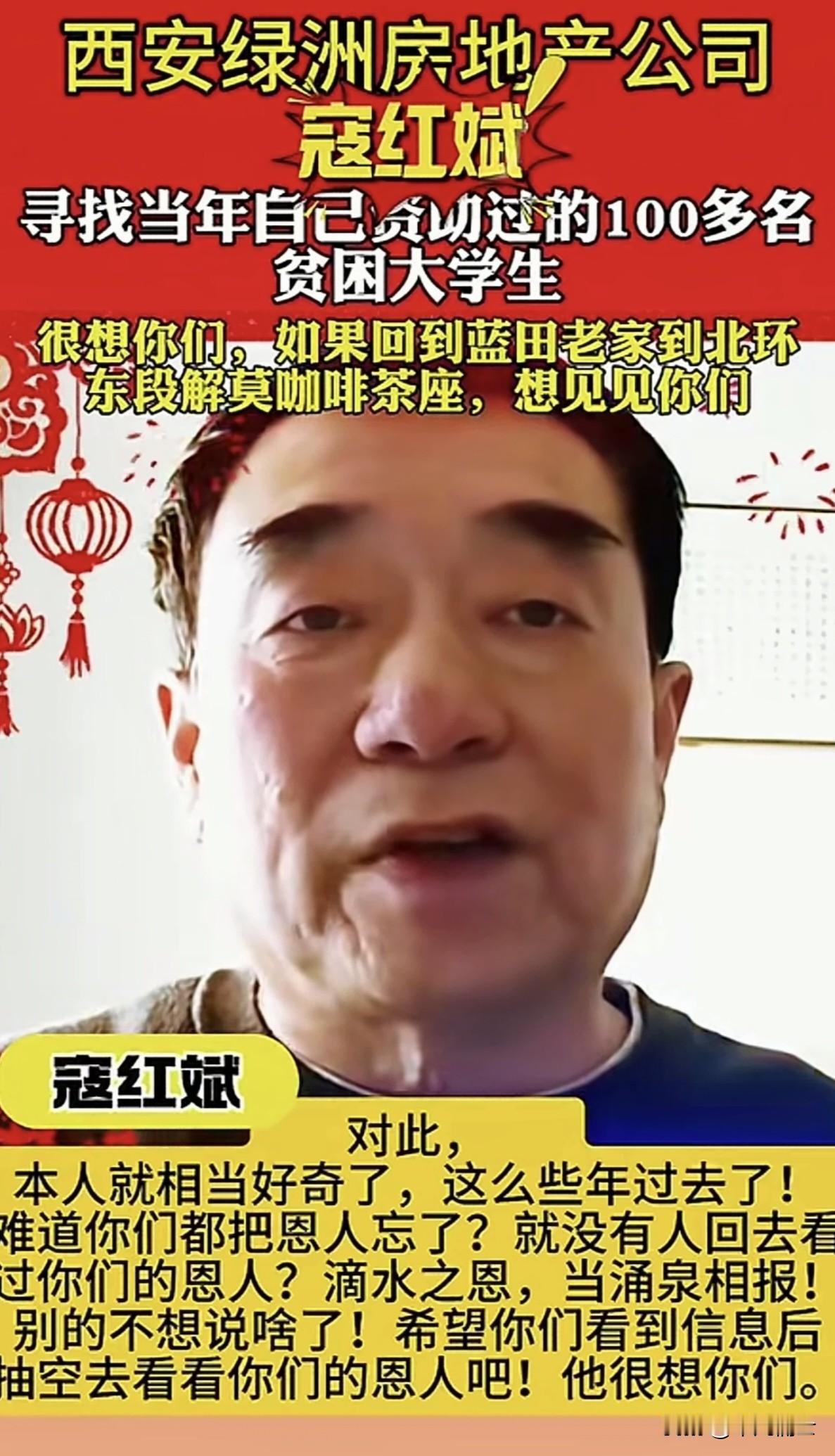 看到陕西某企业家寻找自己当年资助的大学生的视频,我想他的心愿很朴素,就是想了解那些自己曾经资助的学生现在的情况怎么样。而那些学生在时隔多年以后还会不会联系到这位企业家,向他表示感谢,汇报一下自己学习、工作和生活的情况呢?我们只能等待。 中国人向来有着乐善好施的传统,社会各界都在尽自己的能力帮助需要帮助的人。这位企业家的当年的善举,或许让那些寒门学子们有了走出家乡,到更广阔天地施展才干的机会,他们也确实应该感谢这位企业家的资助。作为被资助人,也应该向资助人报告一下自己的情况,让资助人了解自己的捐赠实际利用情况。可不知道为什么这么多的学子当年没有一个人和这位企业家联系,汇报一下自己的情况呢!还记得当年知名公益人丛飞把自己的所有收入都拿来资助学生,可在自己病危之际还不断收到逼捐的信息,却鲜有资助学生到医院看望。我们真的希望这样让人寒心的事情再次发生。 中国人讲:“滴水之恩当涌泉相报!”那些当年的少年应该也早步入社会,或许成为社会中坚力量,如果有了反哺社会的能力,就应该把这种精神传承下去。也及时让当年的资助人了解自己的情况,知道社会的善良在不断延伸,我想这位企业家应该感到更加高兴。