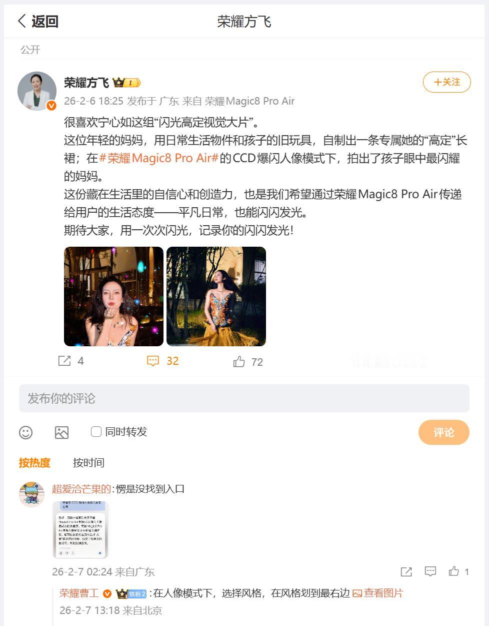 前段时间荣耀产品线总裁方飞,为小伙伴推荐的闪光高定视觉大片,是利用荣耀Magic8 Pro Air的CCD爆闪人像模式拍摄,好多小伙伴在MagicOS中找不到启用入口,荣耀研发工程师曹工表示:在人像模式下,选择风格,在风格划到最右边。并附图引导大家,不晓得会不会将这个功能,下放到其他机型中,未来可期,照片最终效果我蛮喜欢的 畅聊数码新品 数码资讯
