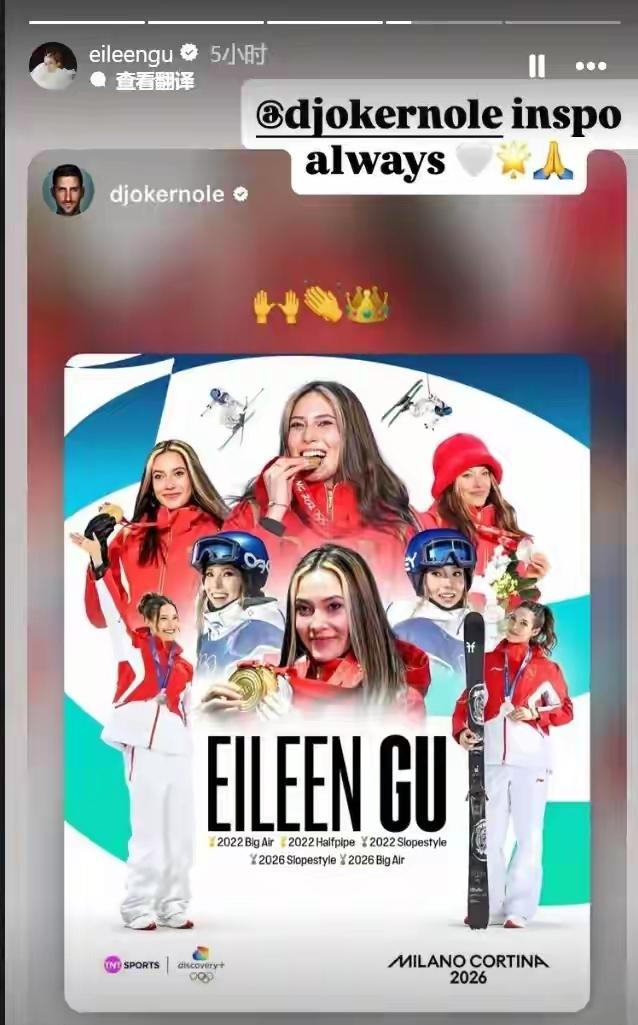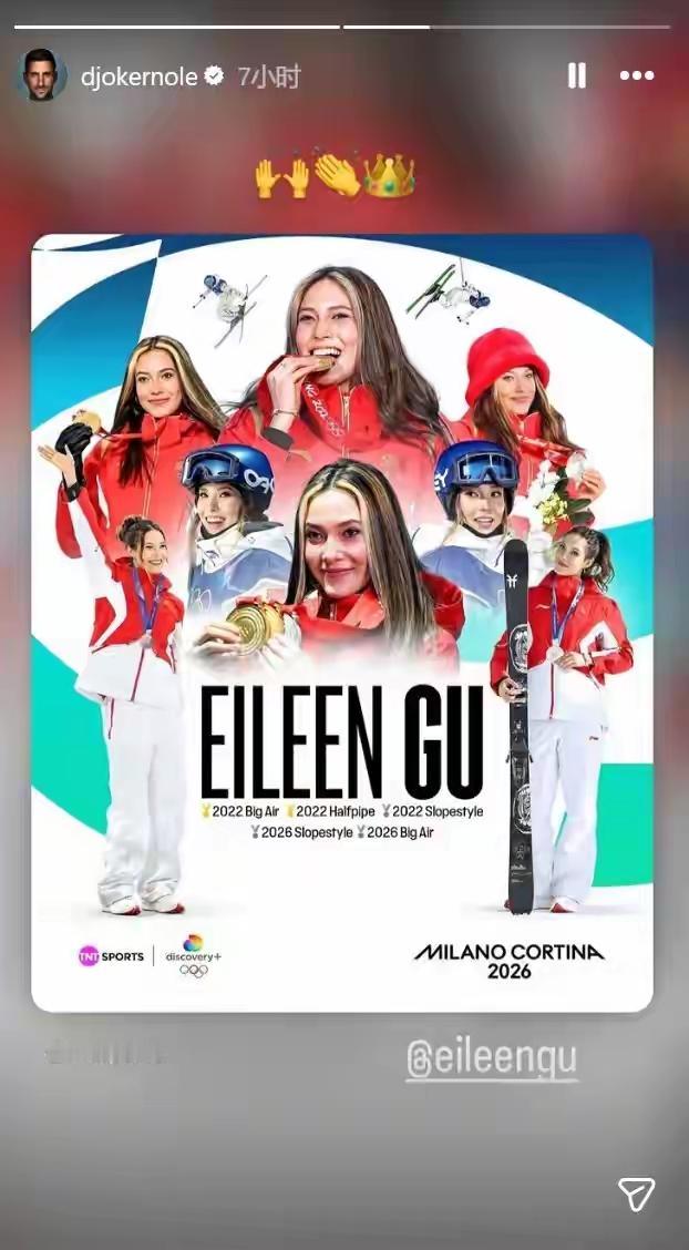 塞尔维亚的网球名将,德约科维奇昨天在社媒上发帖,祝贺谷爱凌拿奖牌,整个图片都是谷爱凌的获奖形象。看来我们的青蛙公主,也很受运动界的喜爱!谷爱凌也回帖,并配文“永远的榜样”,颇有英雄惜英雄的味道。或许运动员才懂运动员的艰辛和付出吧!