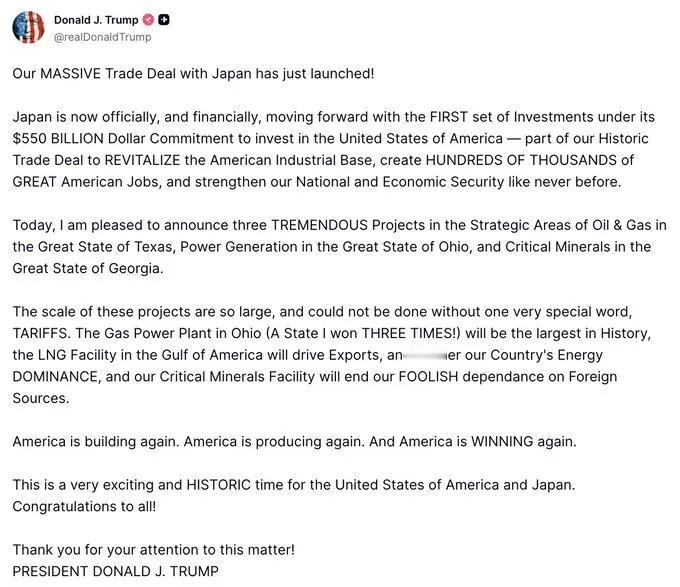 🚨特朗普总统刚刚宣布了一项对美国来说意义重大的胜利! “我们与日本达成的巨额贸易协议正式启动!日本正在兑现其5500亿美元投资承诺的第一波,这将重振我们的工业基础,创造数十万个优质的美国就业岗位,并极大地增强我们的国家和经济安全!” 三个意义非凡的项目即将启动: - 俄亥俄州破纪录的燃气发电厂(史上规模最大!) - 墨西哥湾巨型液化天然气设施,助力美国能源主导地位和出口 - 佐治亚州关键矿产设施,彻底摆脱我们对外国资源的依赖 所有这一切都源于一个神奇的词:关税! 🚨President Trump just announced a MASSIVE WIN for America! "Our MASSIVE Trade Deal with Japan has launched! Japan is now pouring in the FIRST wave of its $550 BILLION commitment to invest in the USA, revitalizing our industrial base, creating HUNDREDS OF THOUSANDS of great American jobs, and supercharging our national & economic security!" Three TREMENDOUS projects kicking off: - Record-breaking Gas Power Plant in Ohio (the largest in history!) - Huge LNG facility in the Gulf for energy dominance & exports - Critical Minerals facility in Georgia to END our dependence on foreign sources All made possible by one magic word: TARIFFS!