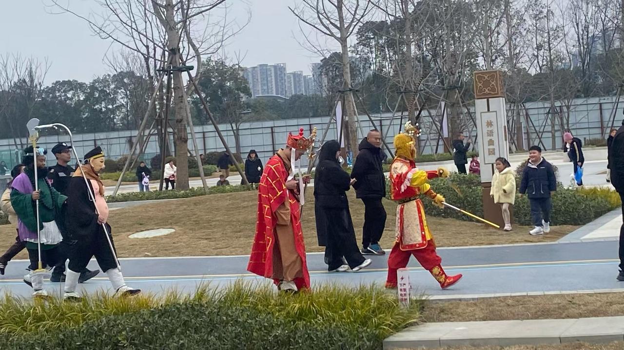 冬日生活打卡季师徒四人穿越到现代街头,猴哥开路,师父压阵,这波“取经”路线,直接走到了城市公园里。