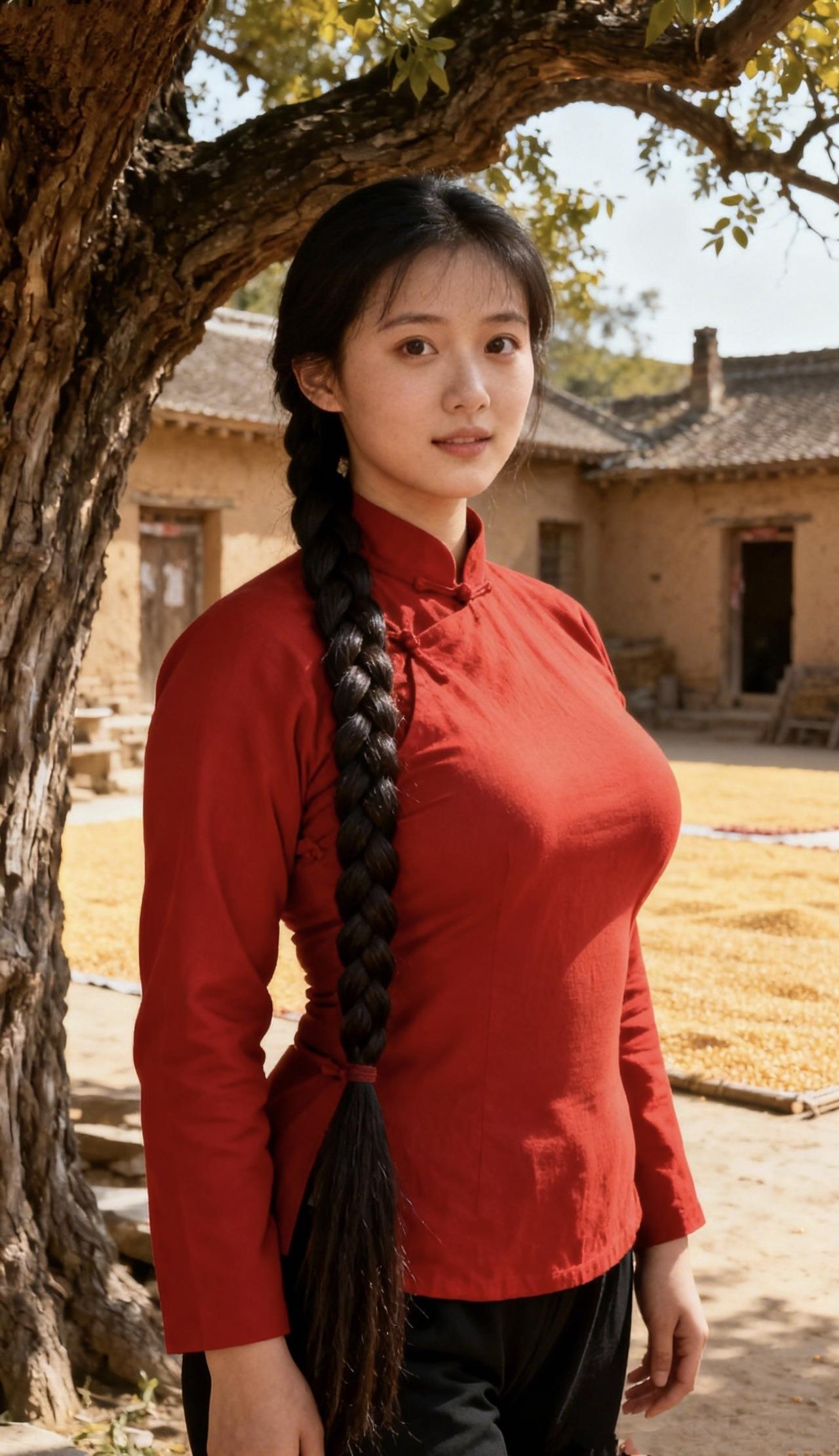 《红衫长辫》 老槐虬枝映晴光, 土屋泥墙岁月长。 红衫一领凝朱砂, 长辫如瀑落肩旁。 眸底藏着山与月, 笑里漫过麦与霜。 不施粉黛天然色, 风过衣襟带谷香。 脚边晒场金浪涌, 檐下炊烟绕旧窗。 一身烟火一身韵, 半是温柔半是刚。 待等秋深归雁远, 仍记村头那抹红。 粗布难掩清灵骨, 乡野风华中自浓。 中式红衫韵 雨巷红裙照 几席枫叶红 红衫风拂照 山畔红裳 红衫古韵 红衫拍照