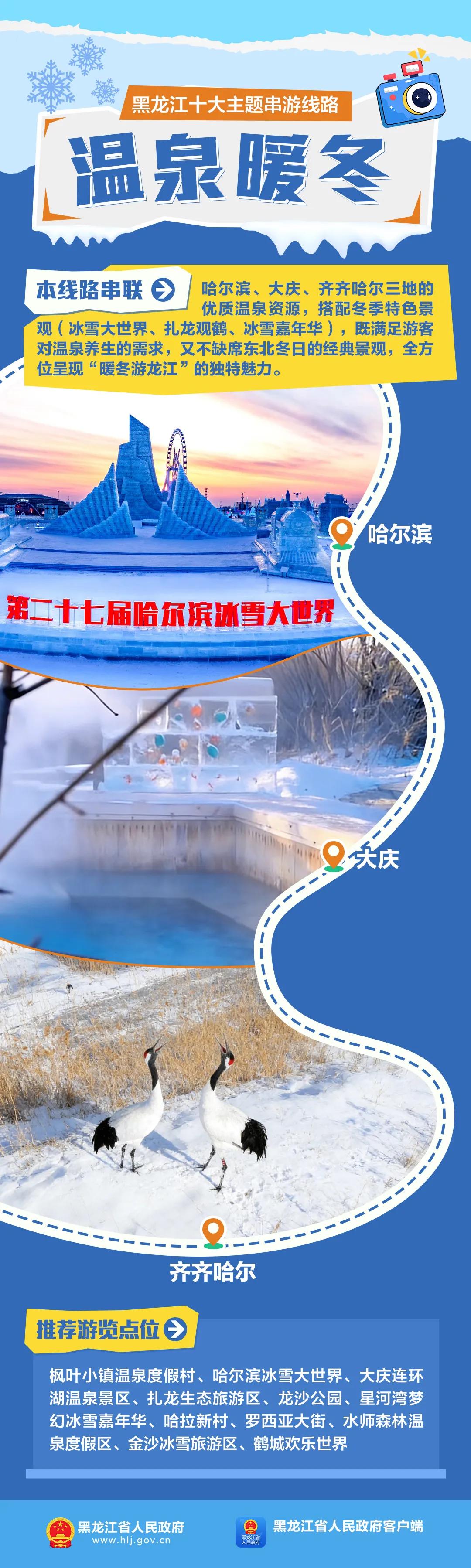 黑龙江暖冬新玩法!温泉暖冬串游线路上线,冰天雪地里泡温泉太爽了 谁说冬天的黑龙江只有冰天雪地的清冷?2026黑龙江十大主题串游线路重磅来袭,解锁冬日龙江新体验,而其中的温泉暖冬线路更是把东北的浪漫与舒适拉满!在零下的冰天雪地里泡着热腾腾的温泉,一边看冰雪盛景一边享暖汤惬意,这份独属于龙江的冬日快乐,一定要来体验! 黑龙江从不是只有冰雪的单调,这次推出的10条主题串游线路覆盖全省东西南北,自然奇观、人文风情、运动休闲、边境体验一网打尽,童话雪乡的浪漫、亚布力滑雪的激情、寻最东最北的仪式感,你想要的冬日美好这里都有。而这次重点出圈的温泉暖冬线路,更是精准拿捏了冬日出游的幸福感,串联哈尔滨、大庆、齐齐哈尔三地核心资源,将温泉养生与东北冬日经典景观完美融合,让你在冰天雪地里感受极致的温暖与惬意。 哈尔滨:冰雪童话里的暖汤治愈 作为线路起点,哈尔滨把冰雪浪漫和温泉舒适做到了极致。打卡第二十七届哈尔滨冰雪大世界,在梦幻的冰雕雪堡中穿梭,看冰灯璀璨、雪韵多姿,沉浸式感受东北冰雪的震撼;玩累了就奔赴枫叶小镇温泉度假村,泡进温热的温泉池中,让暖意包裹全身,化解冬日的寒冷与疲惫,冰雪与暖汤的碰撞,氛围感直接拉满。 大庆:湖畔温泉的悠然时光 从哈尔滨出发到大庆,解锁连环湖温泉景区的独特魅力。连环湖的温泉藏着自然的馈赠,在湖畔边泡温泉,看冬日湖面的静谧雪景,听风吹过的轻响,远离城市喧嚣,享受独属于自己的悠然时光。这里的温泉养生体验拉满,在暖汤中舒缓身心,感受大庆这座城市的冬日温柔。 齐齐哈尔:自然与暖汤的双重美好 齐齐哈尔站更是将自然景观与温泉体验完美结合,让旅途的美好再升级。去扎龙生态旅游区,看丹顶鹤在雪地中翩跹起舞,感受自然生灵的灵动与美好,解锁东北冬日独有的生态美景;逛一逛龙沙公园,感受冬日园林的静谧与别致,打卡星河湾梦的特色体验;玩遍之后泡一场暖汤,将一路的美景与欢喜,都融在温热的泉水中,惬意至极。 这条温泉暖冬线路,不仅串联起三地的优质温泉资源,更将冰雪大世界、扎龙观鹤、冰雪嘉年华等东北冬日经典景观一网打尽,既满足了游客对温泉养生、舒缓身心的需求,又不让你缺席东北冬日的极致美景,全方位呈现“暖冬游龙江”的独特魅力,打造主题沉浸、多元体验的冬日游玩新花样。 不用再羡慕南方的温泉度假,黑龙江的冬日温泉才是独一份的浪漫!在冰天雪地中泡温泉,看漫天飞雪落肩头,周身却是温暖的泉流,这种极致的反差感,只有在龙江才能体验到。 这个冬天,别再宅家啦!奔赴黑龙江,打卡这条温泉暖冬串游线路,从哈尔滨到大庆再到齐齐哈尔,一路玩冰雪、泡温泉、赏美景,把东北的冬天玩出不一样的花样,在冰与火的碰撞中,感受最地道的龙江暖冬风情! 黑龙江暖冬游 温泉旅游 东北冰雪旅游