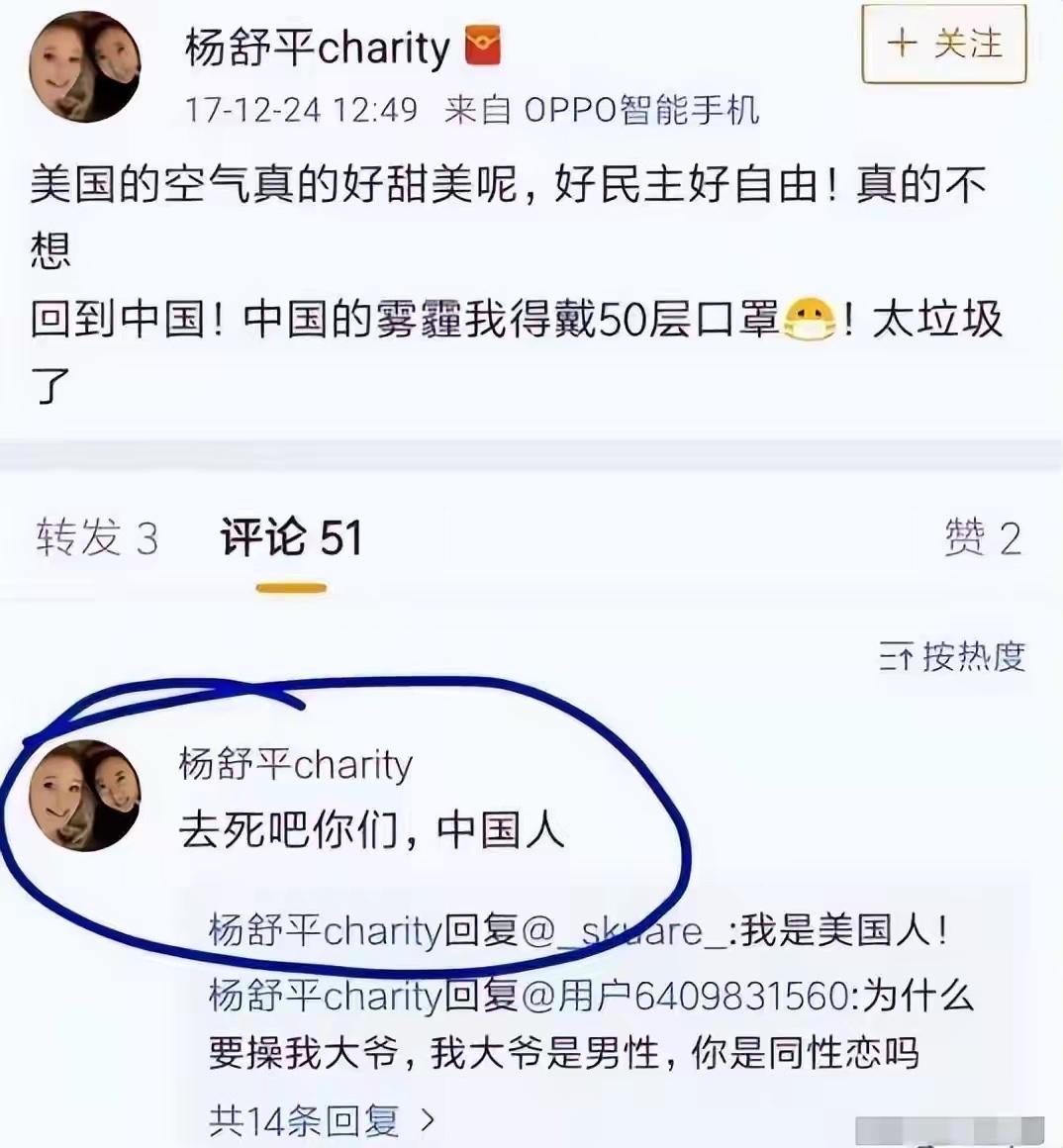 “空气香甜女”杨舒平,已被美国驱逐出境,如今回国下场大快人心。 杨舒平1993年出生在云南昆明,父母都是当地公务员,家庭条件稳定。她从小接受良好教育,学习成绩一直不错,顺利拿到全额奖学金,前往美国马里兰大学留学。2017年5月,她在学校毕业典礼上发表演讲,公开贬低家乡昆明的空气质量,刻意夸赞美国空气清新香甜,这番言论被现场拍摄并传到网络,迅速引发全网热议。 当时昆明官方发布的空气质量数据显示,当地全年优良天数比例接近满分,根本不存在她所说的出门必须戴多层口罩的情况。她为了迎合现场氛围,刻意歪曲事实,伤害了国人的情感,也让海外中国留学生群体的形象受到影响。马里兰大学中国学生会第一时间发声,澄清事实,挽回被损害的华人形象。 演讲事件发酵后,杨舒平曾在社交平台发布道歉声明,称自己热爱祖国和家乡,只是表达不当。但这份道歉并没有得到公众认可,因为她的言论不是无心之失,而是刻意迎合的刻意表达。事件发生后,她在美国的学习和生活受到明显影响,身边同学和华人圈子对她的态度变得疏远。 本科毕业后,杨舒平想留在美国工作生活,她投递了大量简历,却因为这段负面舆论,没有企业愿意录用她。美国企业做背景调查时,都会查到她的演讲事件,企业担心录用她会引发舆论风险,所以全部拒绝了她的求职申请。 留美无望后,她试图前往韩国发展,可她的负面新闻早已传到韩国,当地企业同样不愿接纳她。在韩国短暂停留后,她既没有合法工作身份,也没有稳定收入来源,只能被迫离开。 她的美国签证到期后,因为没有合法居留资格,被美国相关部门按规定驱逐出境。2025年前后,杨舒平最终回到国内,回到了她曾经贬低过的家乡昆明。 回国后,她的求职之路同样艰难。国内企业招聘时,只要输入她的名字,就能看到当年的演讲事件,没有公司愿意承担舆论风险聘用她。有信息显示,她先后投递上百份简历,全部没有回音。 她尝试过改名换姓,试图重新开始生活,可互联网有记忆,她的过往经历很容易被查到。她也试过做直播等线上工作,一开直播就有网友提及当年的言论,她只能匆匆下线。 如今的杨舒平没有稳定工作,日常只能依靠家人生活,曾经的留学光环彻底消失。她的家人也因为她的言论受到牵连,在当地生活受到不少议论,原本安稳的生活被彻底打乱。 她当年以为靠贬低祖国就能获得国外的认可,却没想到连美国也不尊重不热爱自己国家的人。一个人连自己的根都否定,走到哪里都不会得到真正的尊重。 各位读者你们怎么看?欢迎在评论区讨论。