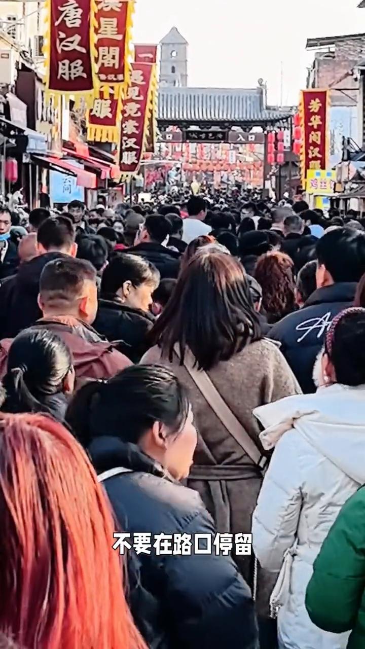 洛邑古城春节人流如潮,十几路大军齐头并进。 洛阳洛邑古城初一人气爆棚到壮观,全线大堵车,初一下午的洛邑古城根本进不去。 洛邑古城门口入园大军朋友们,洛邑古城十路大军人流高空时代,请大家遵守现场工作人员的指引,保持队伍有序,不要在路口停留,优先照顾行动不便于你马年大吉,一路发发发。